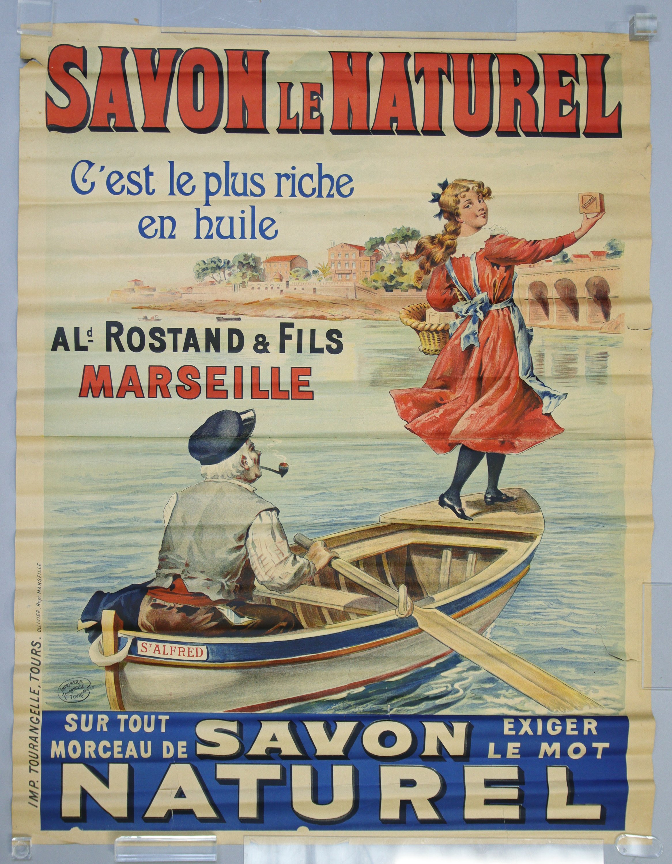 "SAVON LE NATUREL / Cest le plus riche en huile / Ald ROSTAND & Fils MARSEILLE". Vers 1920. Epreuve originale imprimée en couleurs. "Imp. Tourangelle, Tours-Marseille".