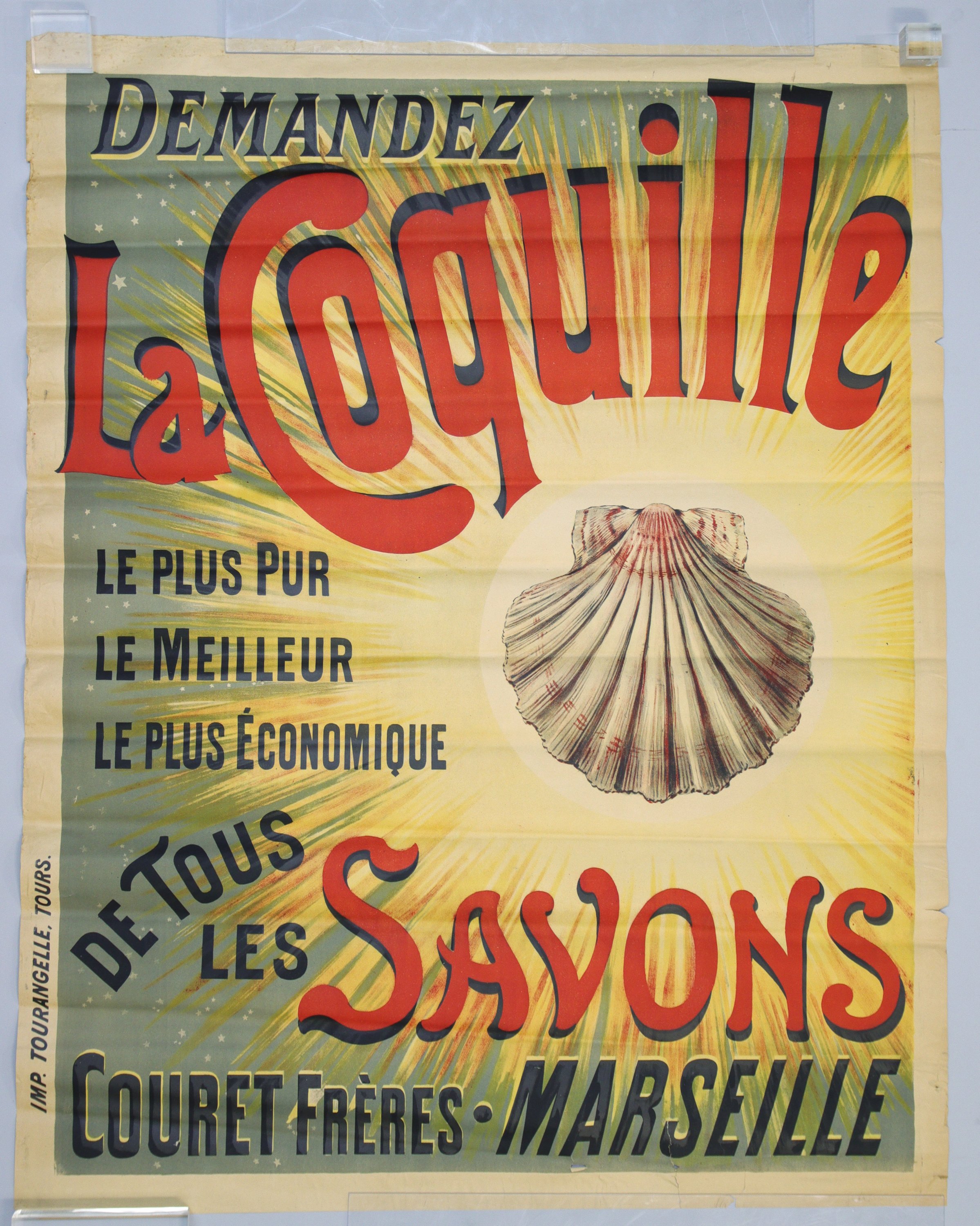 "DEMANDEZ LA COQUILLE / Le plus pur Le meilleur Le plus économique de tous les SAVONS Couret frères - Marseille". Vers 1920. Epreuve originale imprimée en couleurs. "Imp. Tourangelle, Tours".