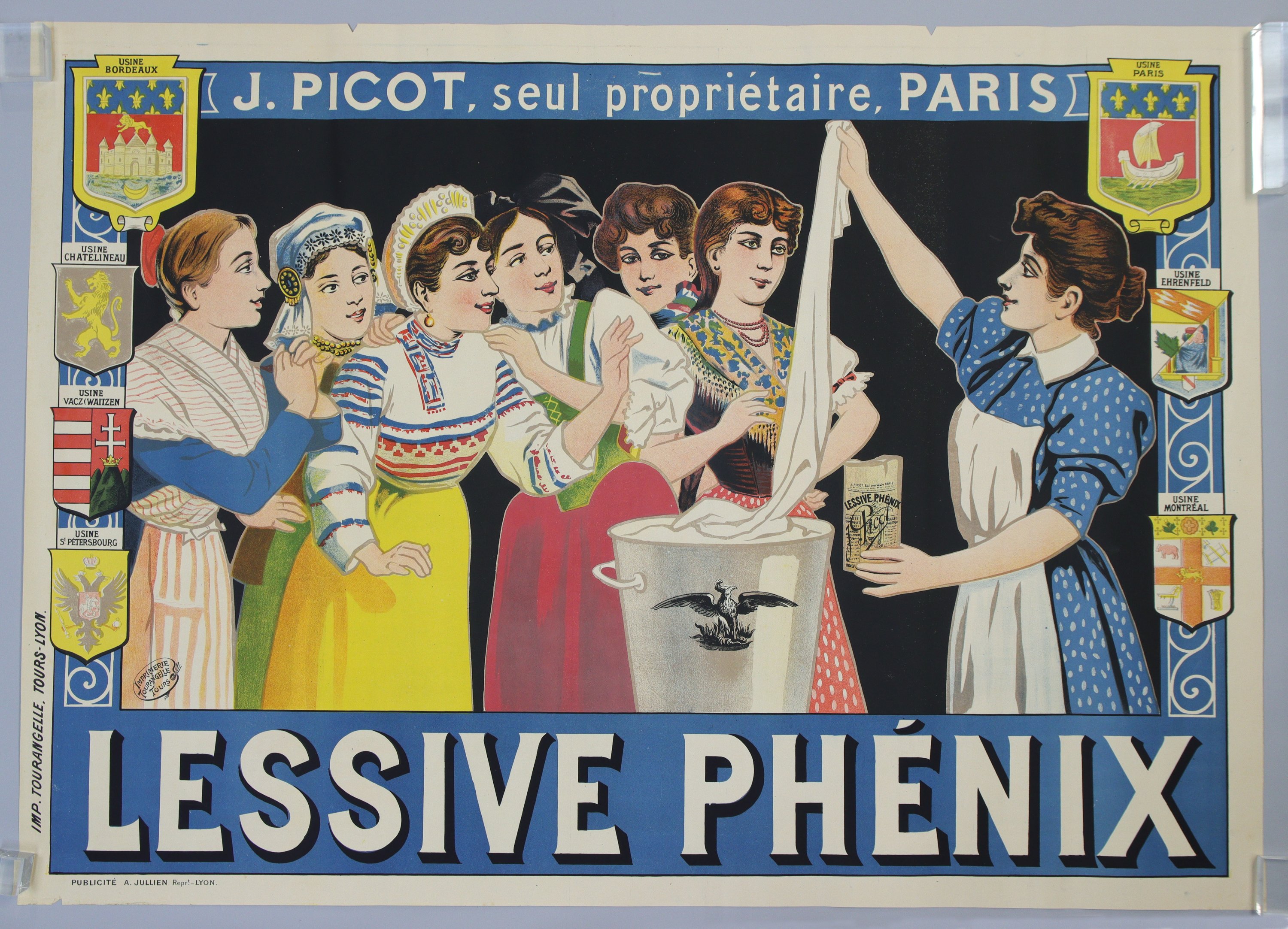 "(J. PICOT, seul propriétaire, PARIS) / LESSIVE PHENIX". Vers 1920. Epreuve originale imprimée en couleurs. "Imp. Tourangelle, Tours-Lyon". Rare et bel exemplaire.