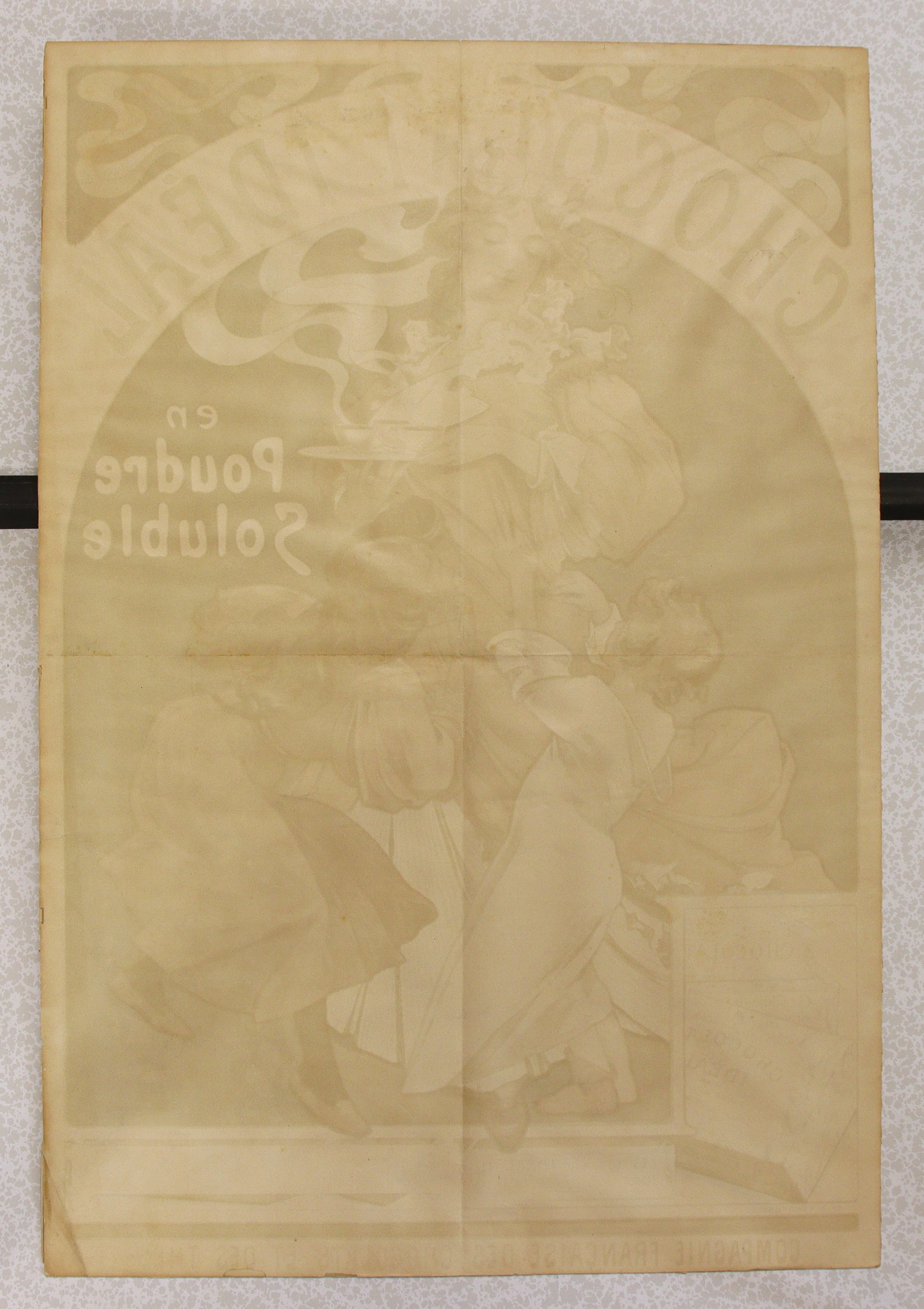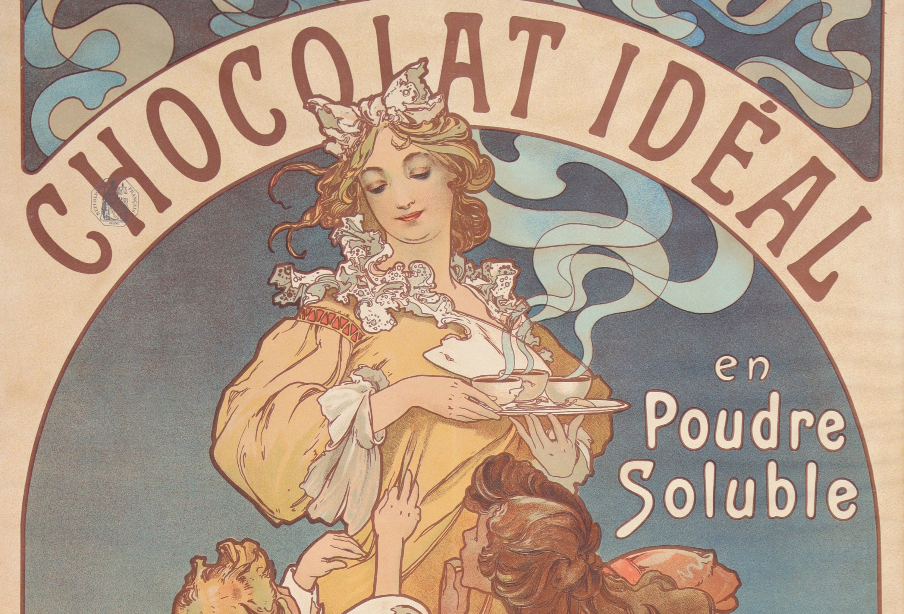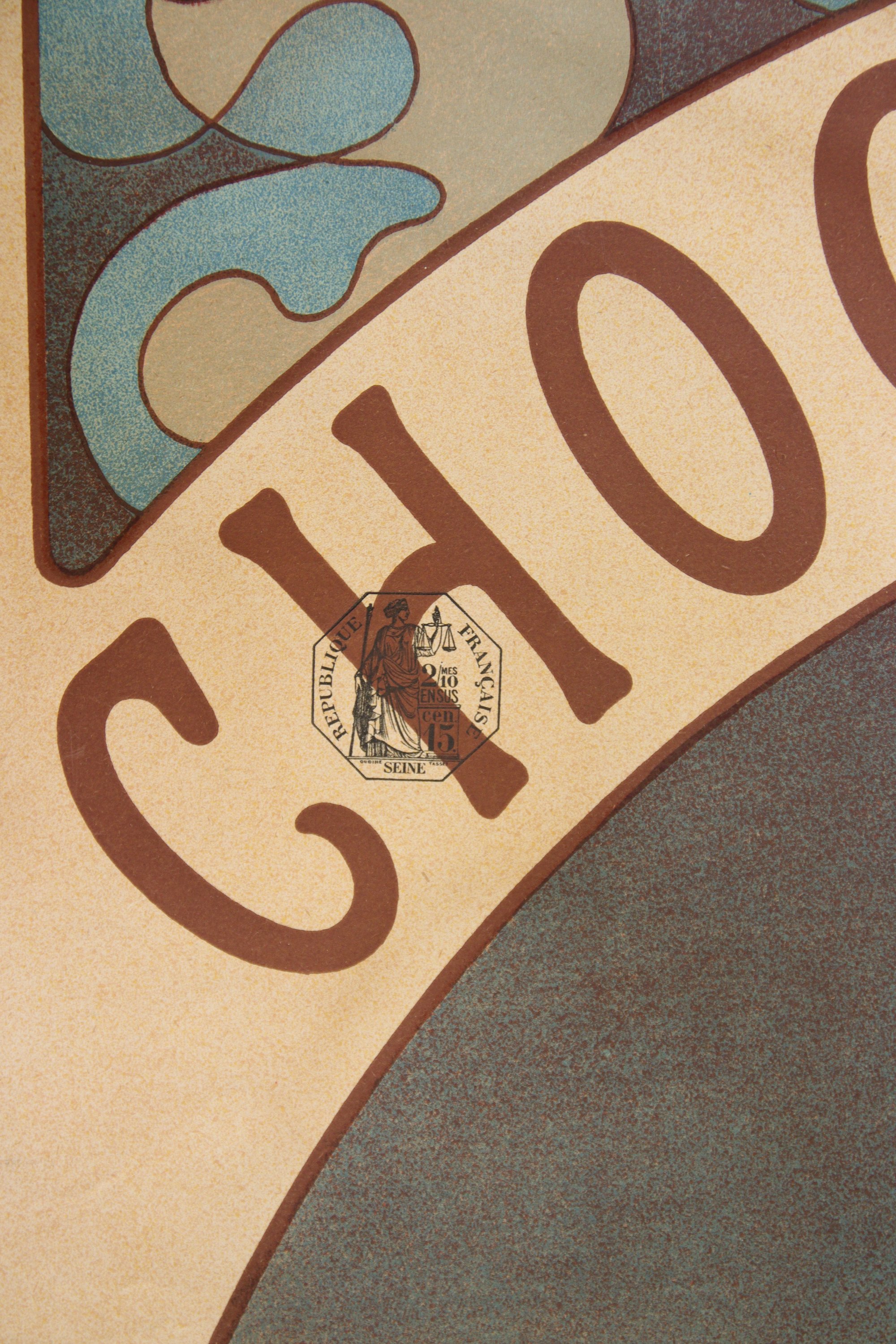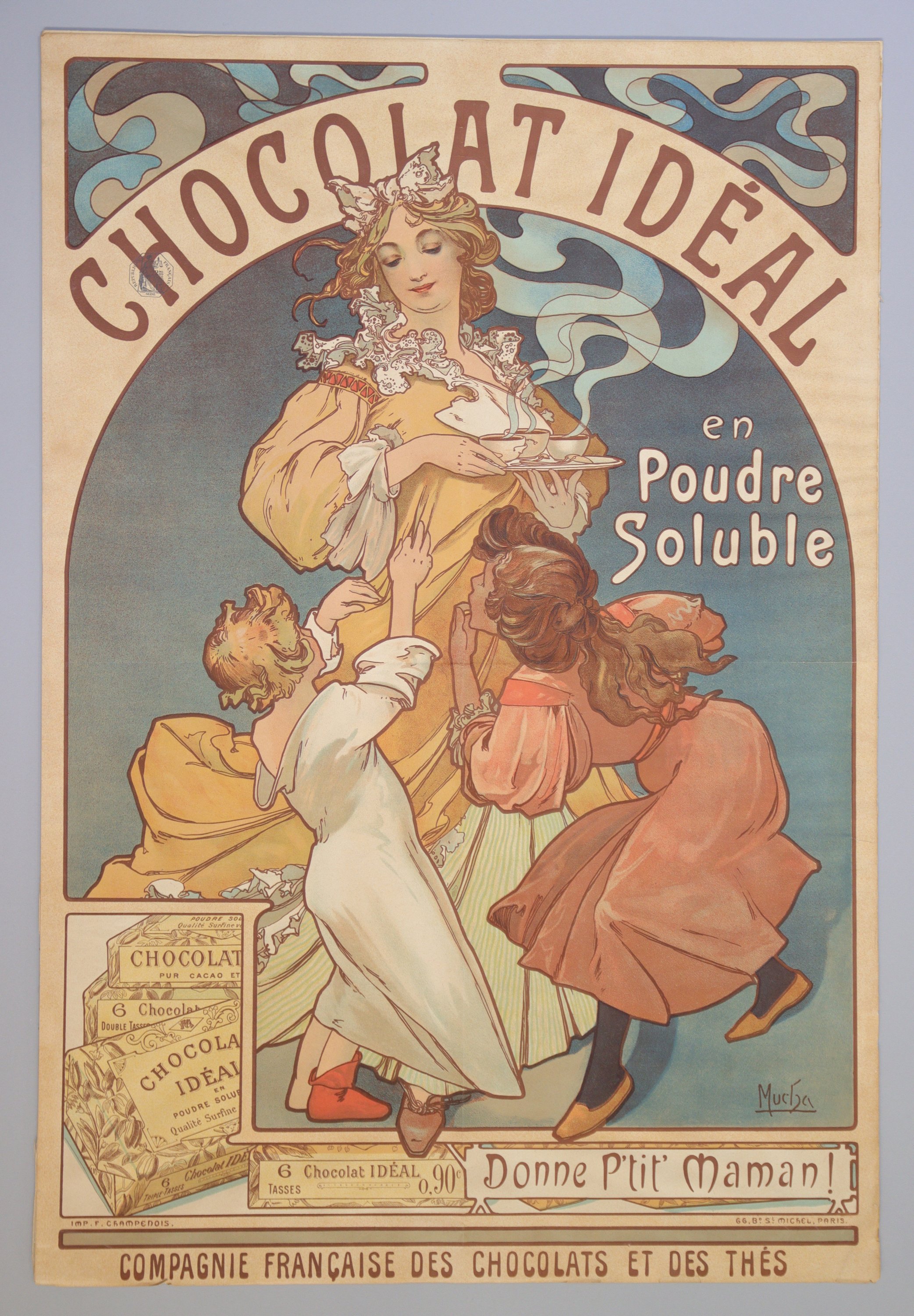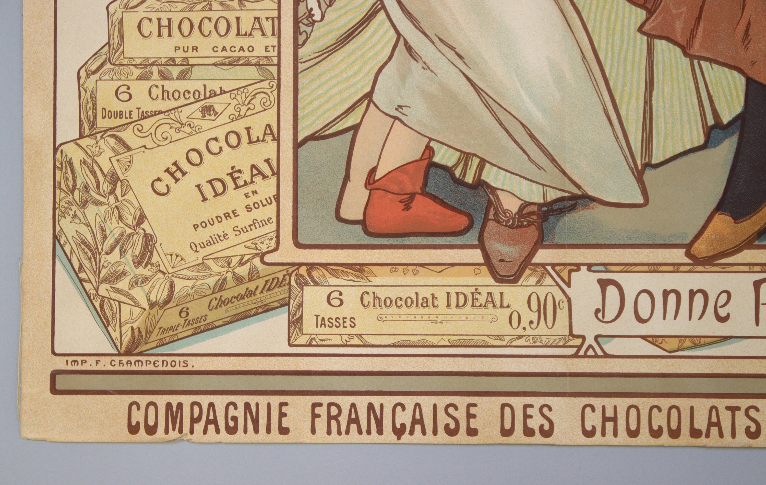 "CHOCOLAT IDEAL/ en Poudre Soluble/ Donne P'tit' Maman!/ COMPAGNIE FRANCAISE DES CHOCOLATS ET DES THES" Signée. [1897]. Belle et rare épreuve imprimée en couleurs "Imp. F. Champenois 66, Bd St Michel, Paris.". Timbre fiscal en haut à gauche.