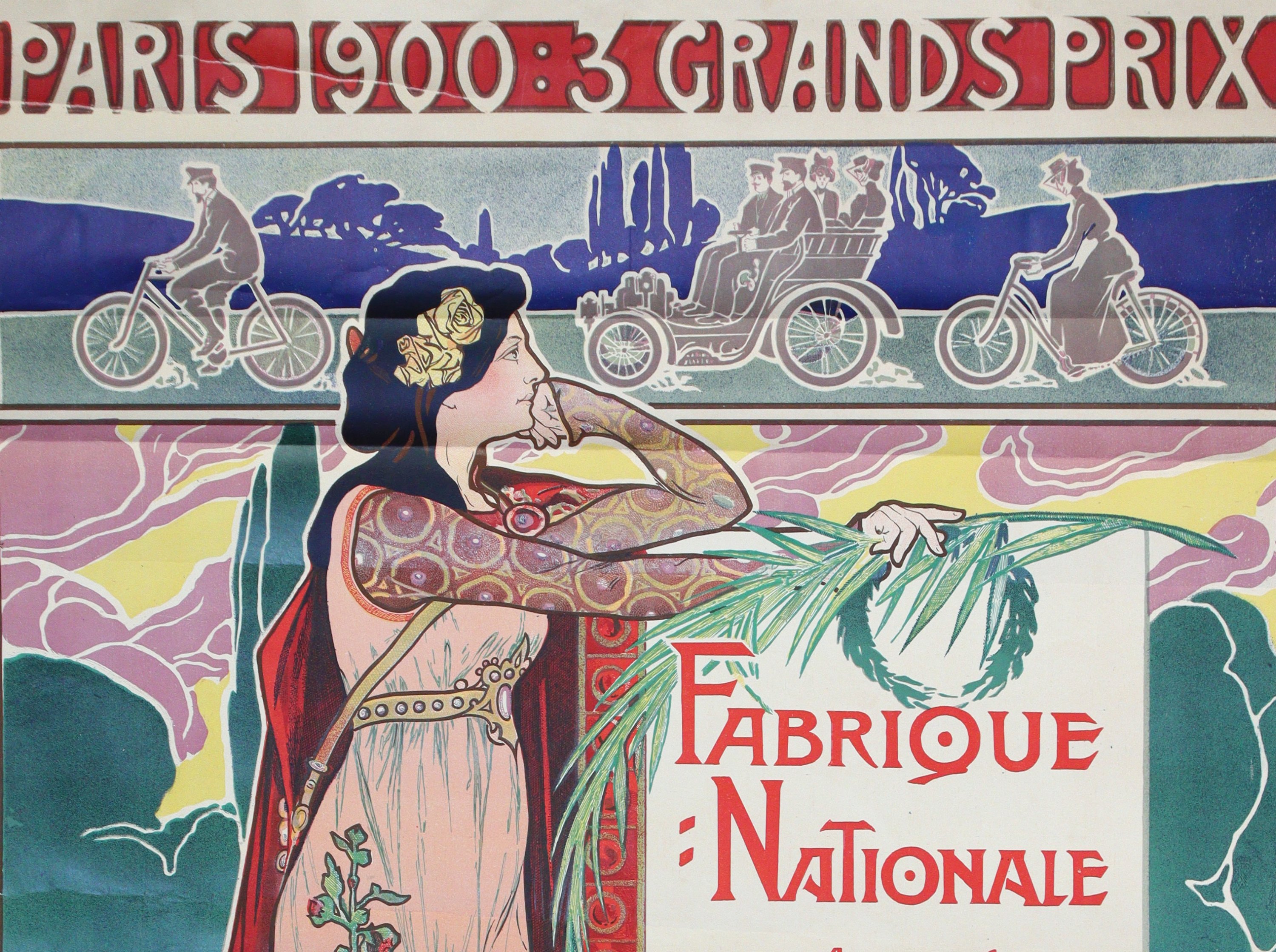 "Pairs 1900: 3 grands prix / Fabrique Nationale d’armes de guerre. Automobiles, cycles, Herstal, Liège, Belgique / FN / Motocyclettes". Epreuve originale imprimée en couleurs "Aug. Bénard, Liège"