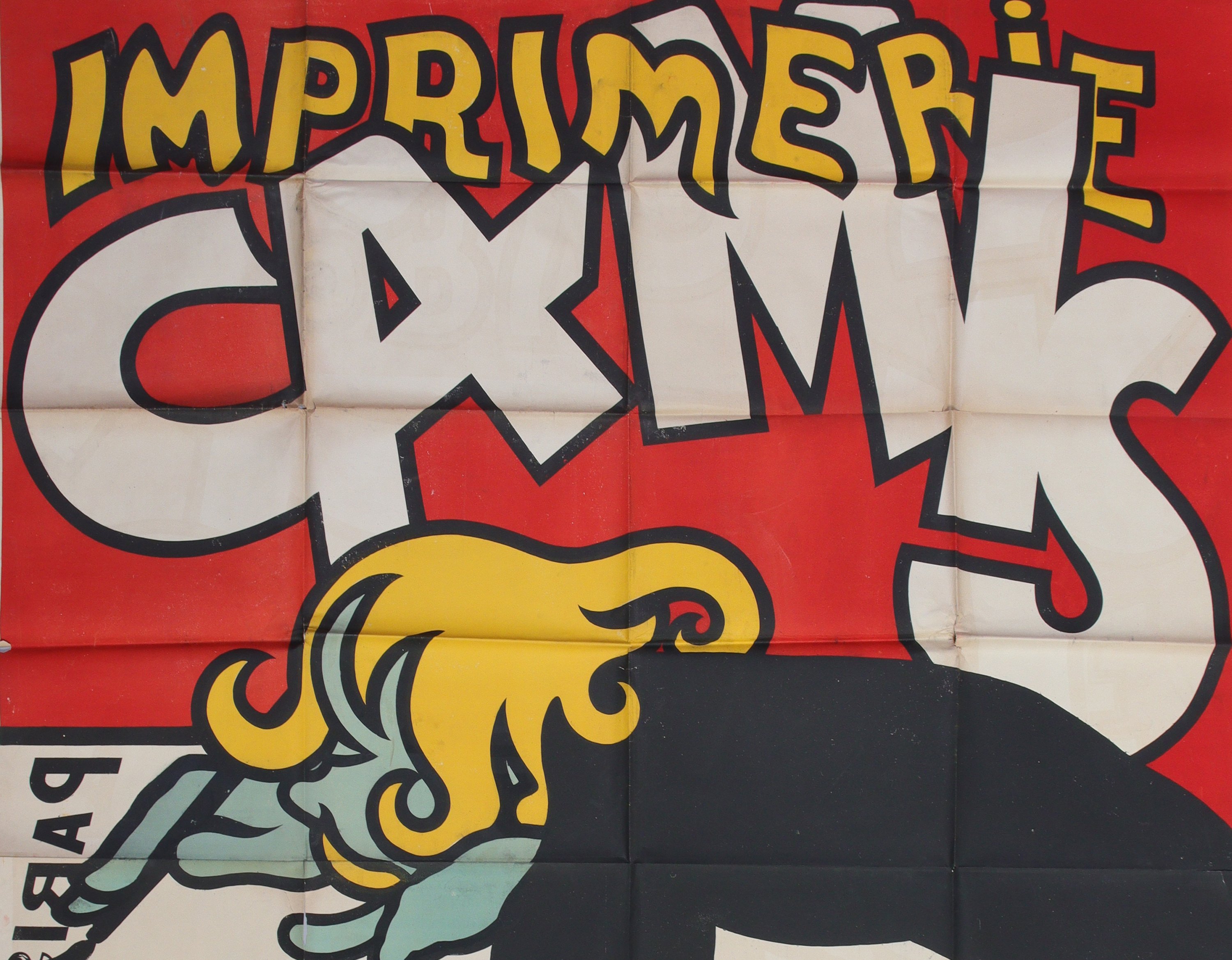 « IMPRIMERIE CAMIS / Les plus grandes machines du monde / Le plus grand format tiré jusquà ce jour en un seul morceau ». Signée et datée 1897. Épreuve originale imprimée en couleurs. Env. 260 x 190 cm. Non entoilée (plis, petites déchirures et qqs rousseurs/salissures).