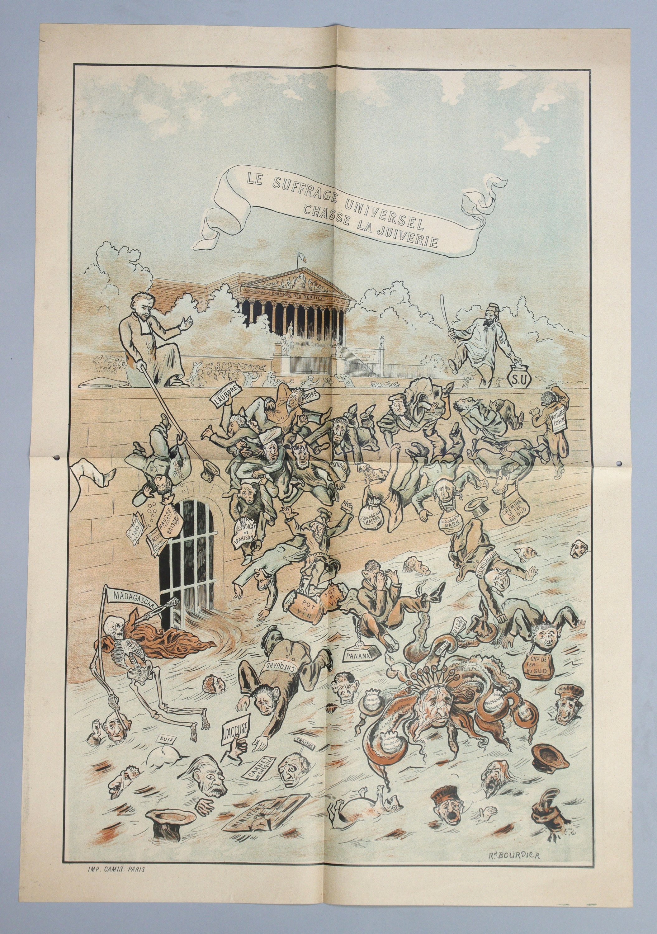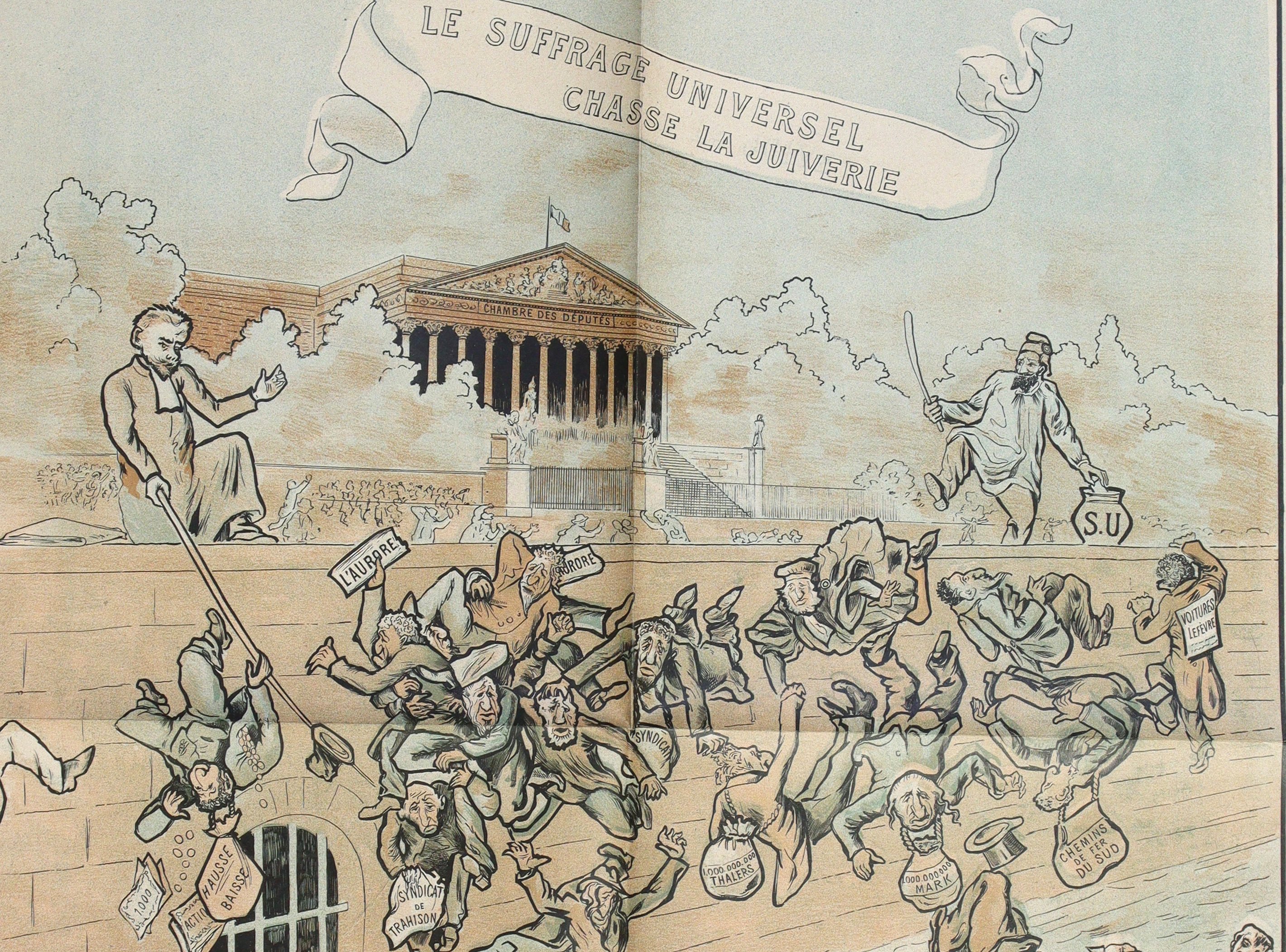 Rarissime exemplaire de ce pamphlet antidreyfusard, qui représente un coin de la Seine devant le Palais Bourbon, sur lequel est inscrit en gros caractères: « Le suffrage universel chasse la juiverie ». Sur le parapet, à droite, se trouve un curé avec une trique ; à gauche, dans la même position, Édouard Drumont, polémiste antisémite habillé en paysan. Sur la chaussée on aperçoit le peuple qui tue les Juifs que Drumont et le curé précipitent ensuite dans les flots. Au nombre des victimes on reconnait: Zola à son « Jaccuse », Dreyfus à son écriteau: « Traître ; les juges à leur costume » et aux lecteurs du journal dreyfusard « lAurore » quils tiennent à la main.