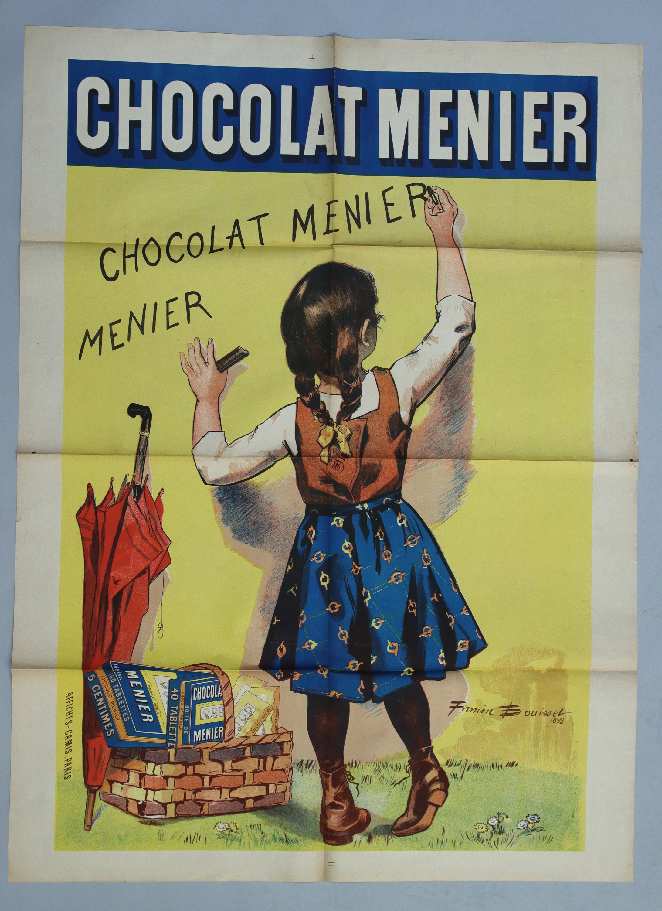Firmin Bouisset est un illustrateur, lithographe et affichiste français qui sest fait connaître surtout pour ses affiches publicitaires, notamment le petit écolier des biscuits LU, le papier à cigarette JOB, et la petite fille du chocolat MENIER qui nest autre quYvonne la fille aînée de lillustrateur, quil utilisa comme modèle lorsque la société Camis lembaucha en 1892. Cette image est connue universellement, devenue incontournable pour la marque Menier.