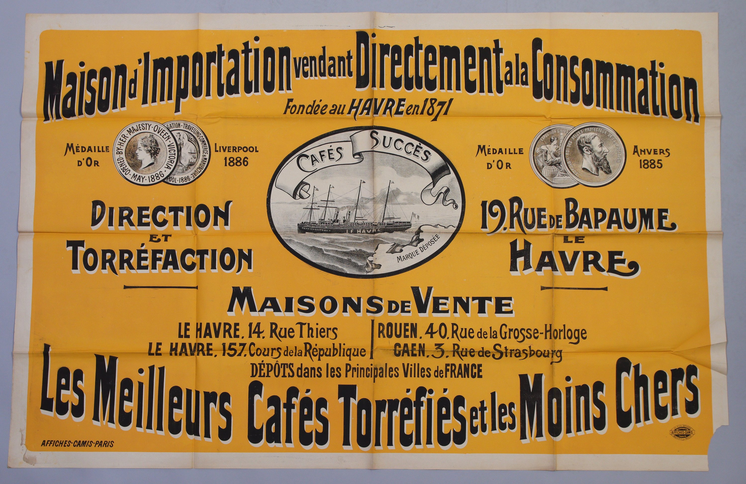 « Maison dimportation vendant directement à la consommation / Fondée au Havre en 1871 / 19 rue de la Bapaume / CAFÉS SUCCÈS / Les meilleurs cafés torréfiés et les moins chers ». Vers 1898. Env. 123 x 184 cm (plis, rousseurs/salissures).