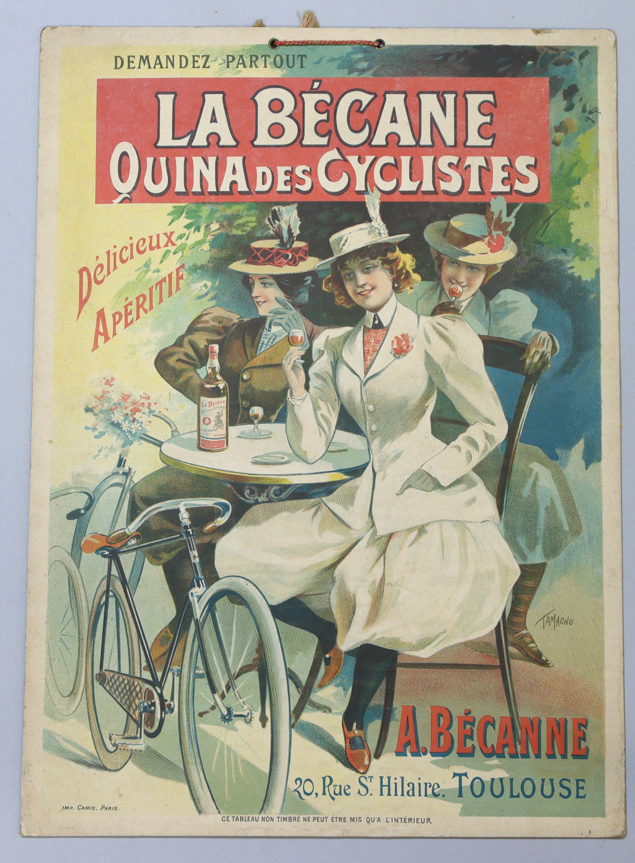 « LA BECANE / Quina des cyclistes / Délicieux apéritif / A. Bécanne 20 rue St Hilaire Toulouse ». Signée. Vers 1898. 46 x 33 cm.
