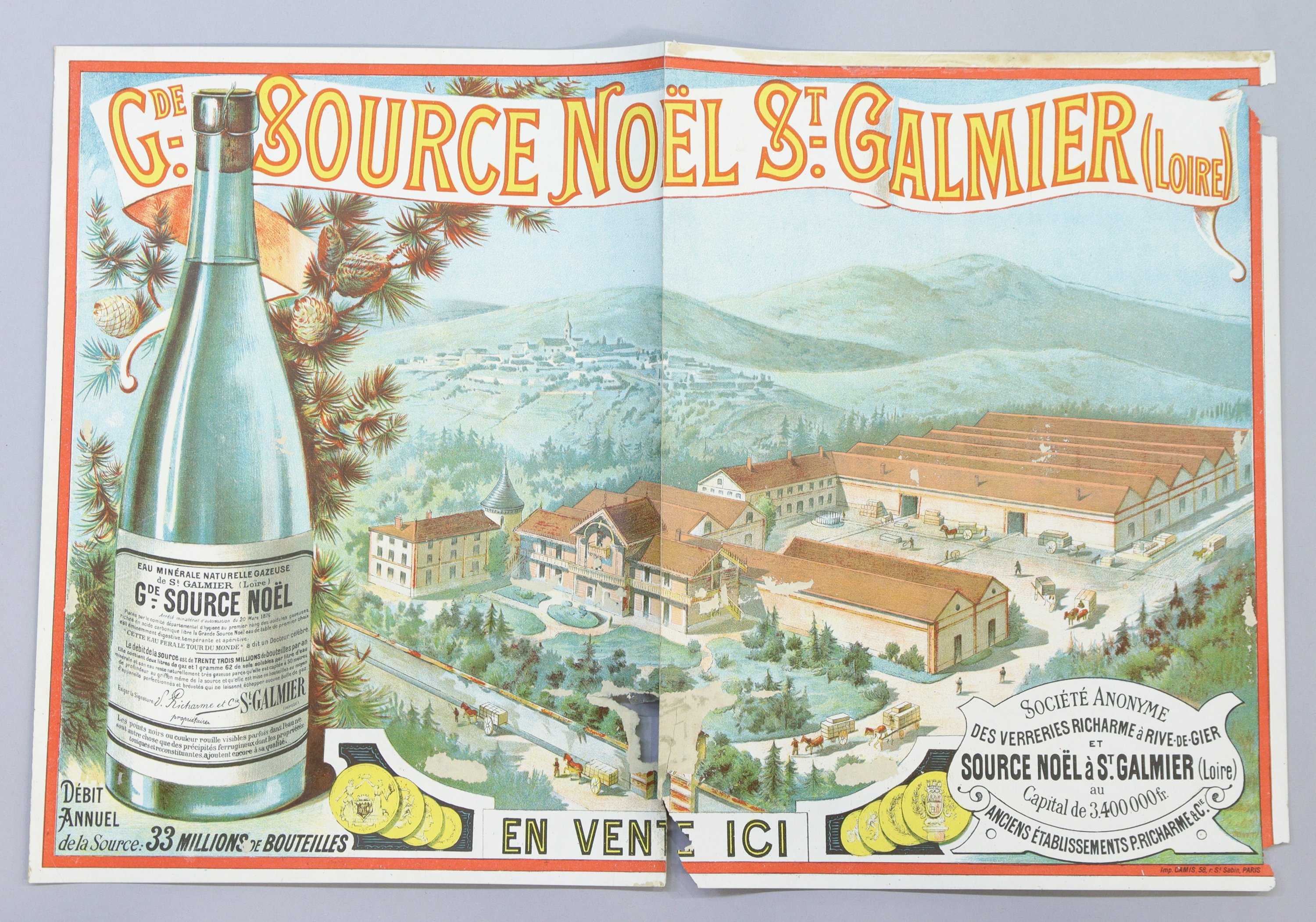 « Gde Source NOËL St GALMIER (Loire) / Eau minérale gazeuse ». Vers 1893 [Imp. Camis, 58 rue St Sabin]. Env. 36,5 x 57,5 cm (plis, manques, rousseurs/salissures).