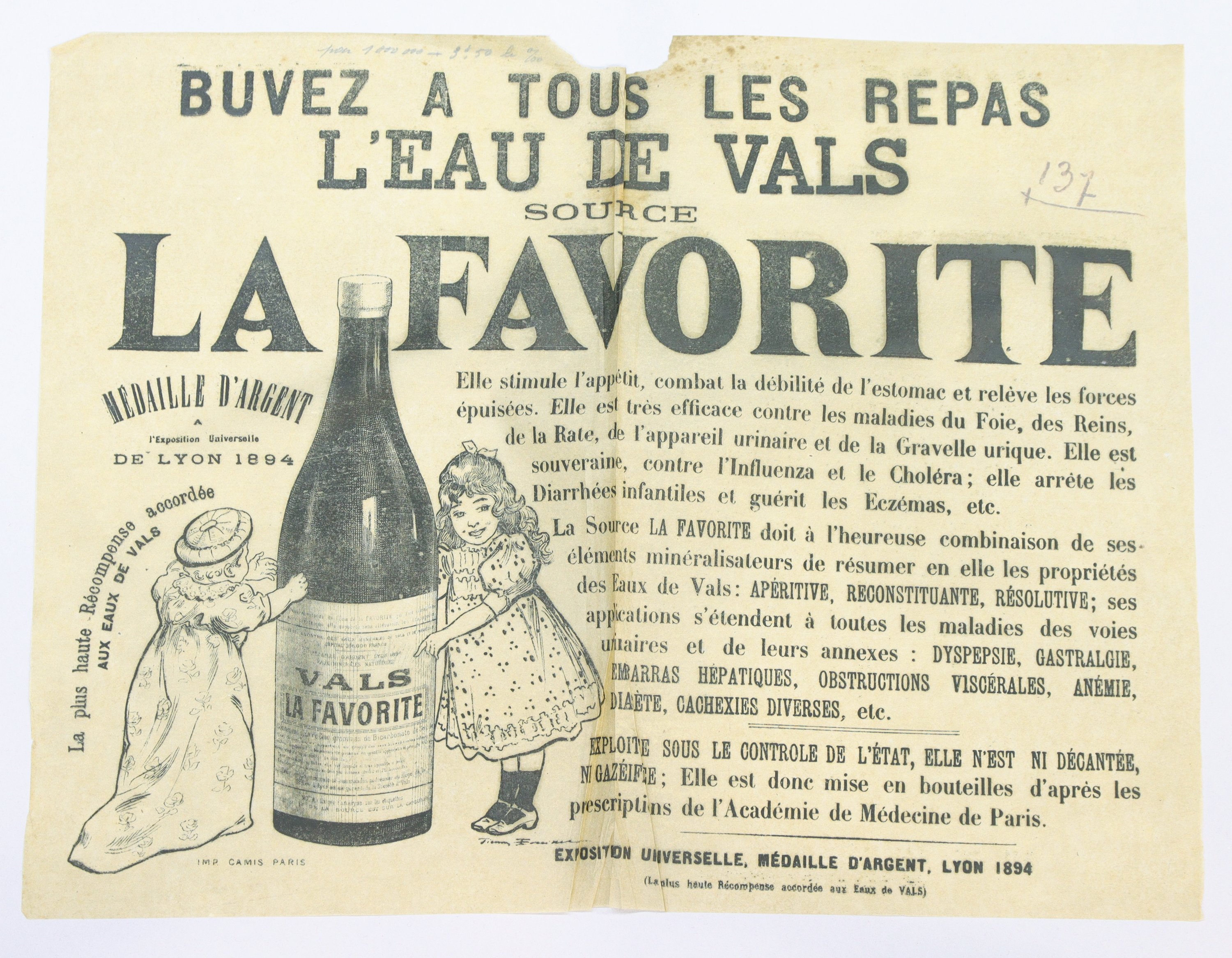 « Buvez à tous les repas / LEAU DE VALS / source LA FAVORITE » [Ardèche]. Vers 1895. Env. 37,5 x 48 cm (plis, petit manque, rousseurs).