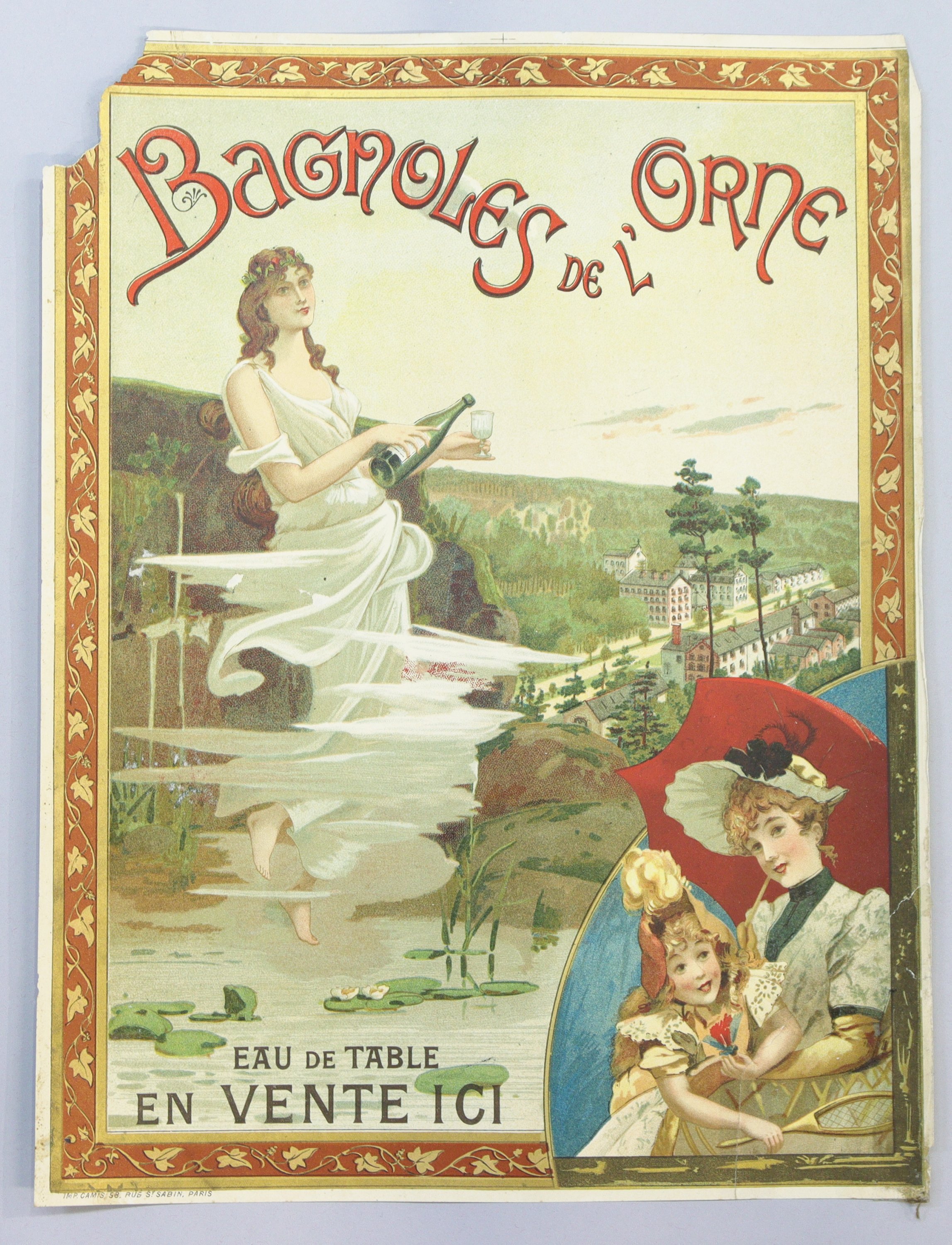 « LA PARISIENNE / Carafe à leau / Eau de source stérilisée ». Signée. Vers 1898. Env. 130 x 100 cm (plis, petites déchirures, rousseurs/salissures) ;