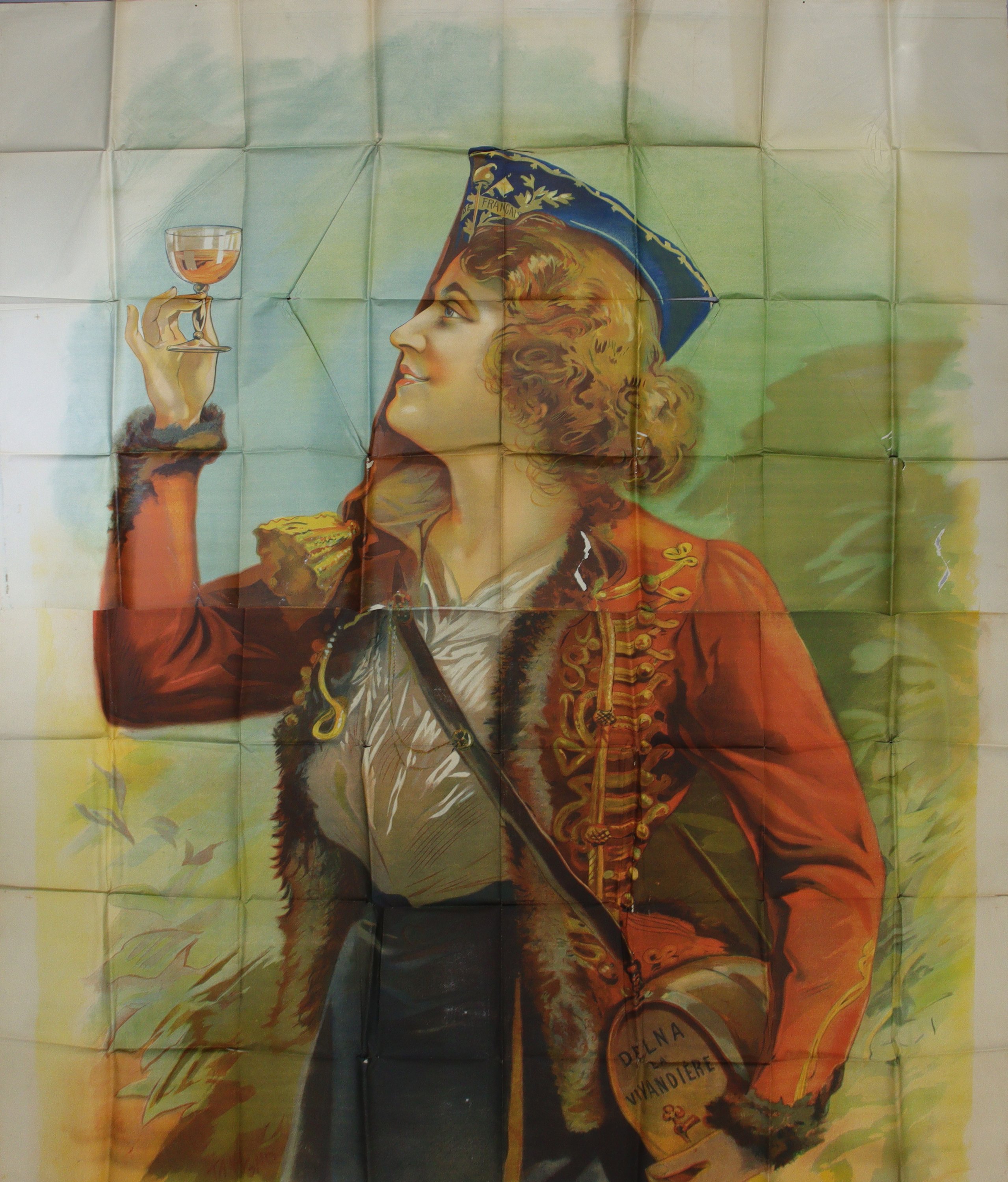 Delna la vivandière [Le vin Désiles]. Affiche avant la lettre. Signée. Vers 1898. Rarissime épreuve grand format en deux parties, imprimée sur « la plus grande machine du monde » de lépoque, env. 300 x 248 cm. En létat (plis, déchirures, rousseurs/salissures).