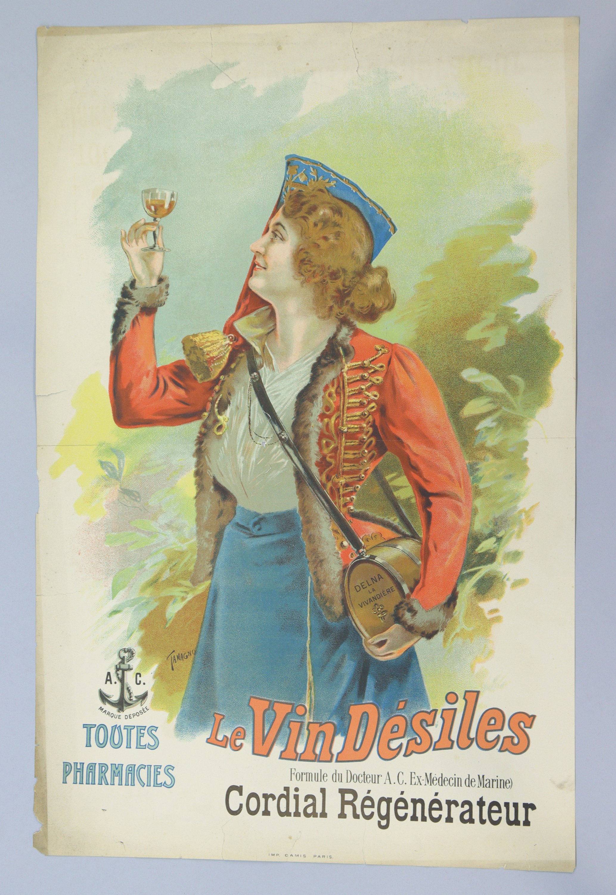 « Le VIN DÉSILES / formule du Docteur A.C. Ex-médecin de marine / Cordial Régénérateur ». Signée. Vers 1898. Env. 56 x 36 cm (plis, déchirures, rousseurs/salissures).