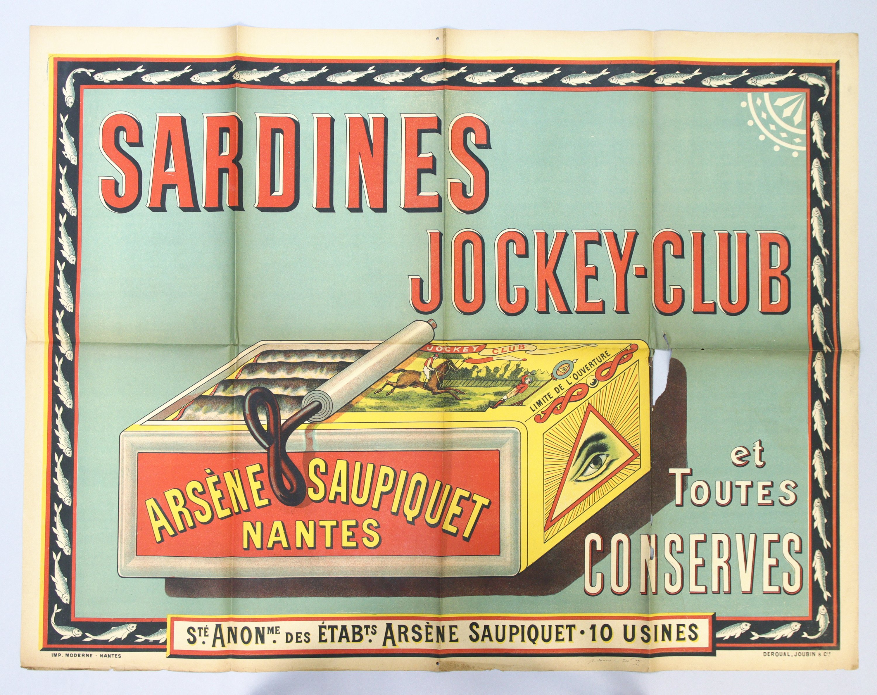 Joint: « SARDINES JOCKEY-CLUB / Arsène Saupiquet Nantes ». Vers 1895. Imp. Moderne Nantes. Env. 130 x 100 (plis, rousseurs/salissures).