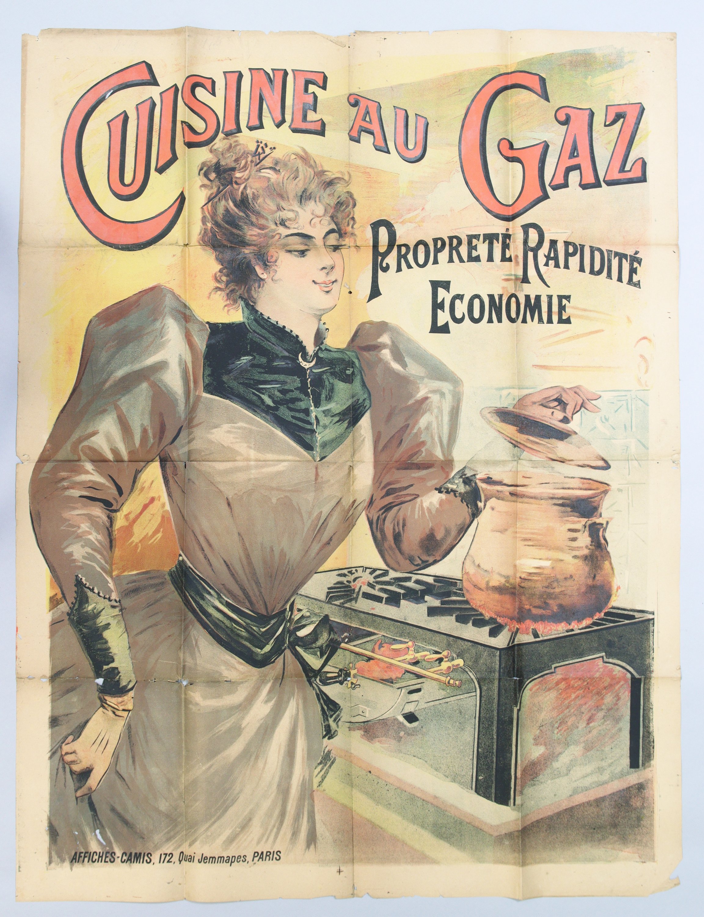 « CUISINE AU GAZ / Propreté, rapidité, économie ». Vers 1898. Env. 130 x 100 cm (plis, petites déchirures, petits manques).