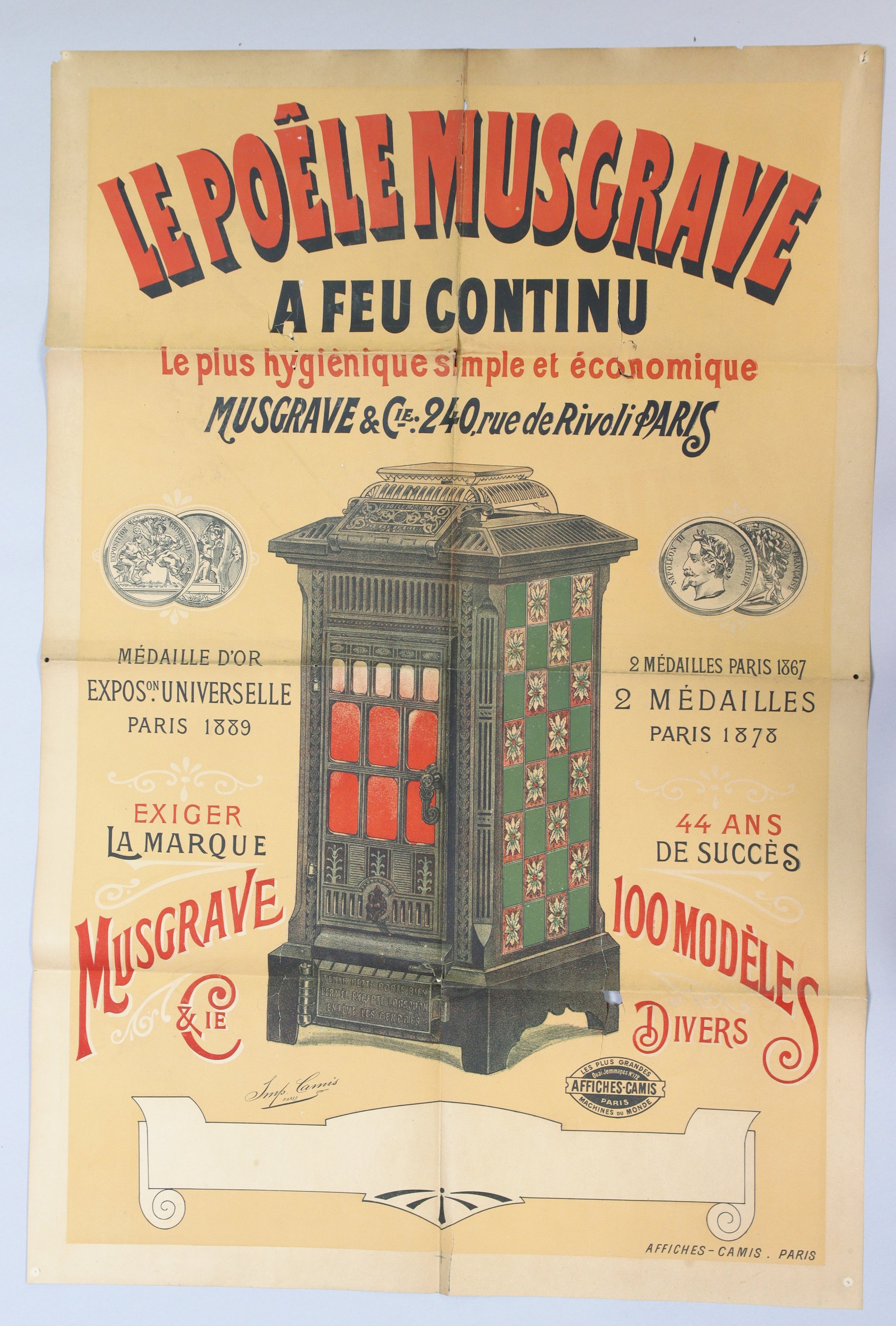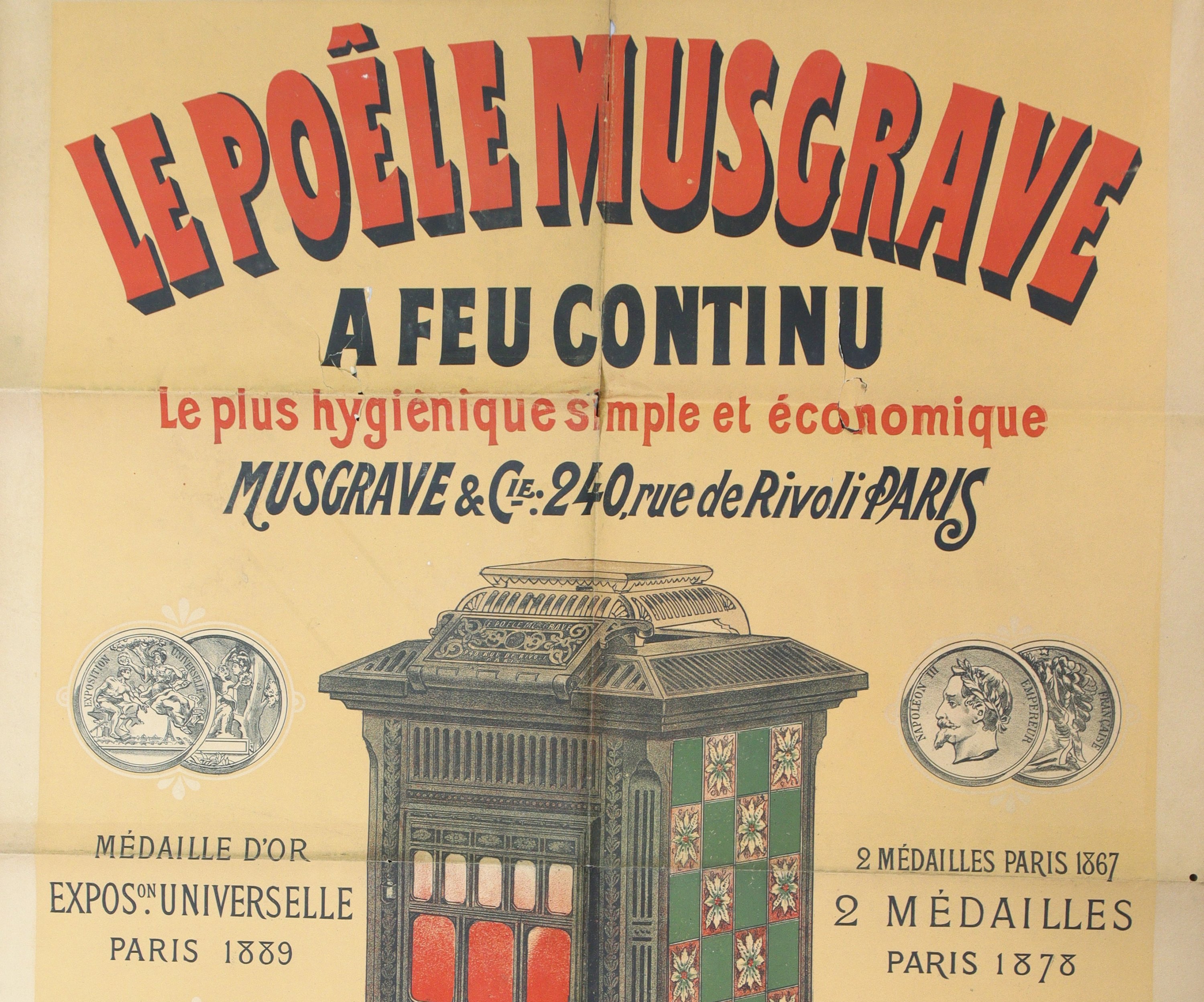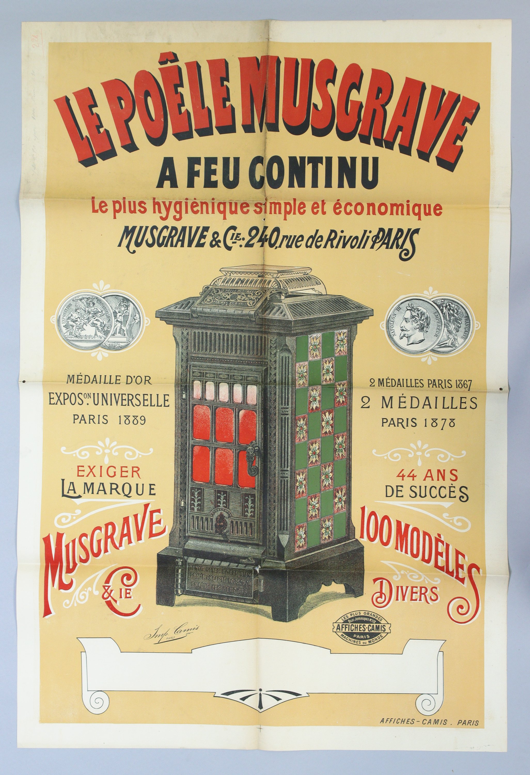 « LE POÊLE MUSGRAVE A FEU CONTINU / Le plus hygiénique simple et économique ». Vers 1898. 2 exemplaires. Env. 120 x 100 cm (plis, petites déchirures, rousseurs/salissures) ;