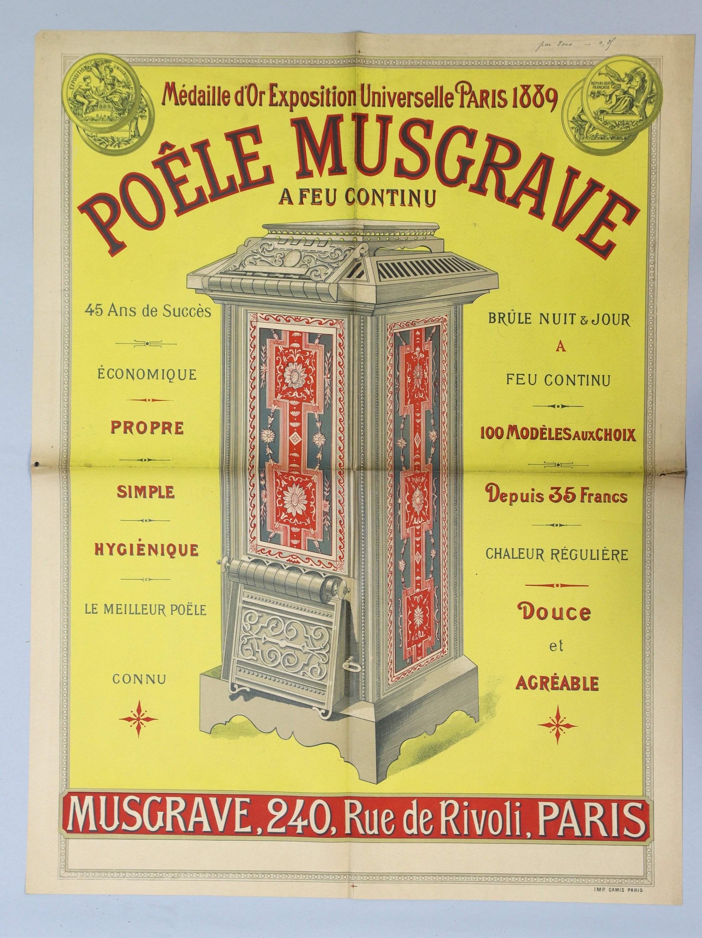 « POÊLE MUSGRAVE à feu continu / Musgrave, 240, rue de Rivoli, Paris ». Vers 1898. Env. 80 x 60 cm (plis, petites déchirures en marge). Bel exemplaire.