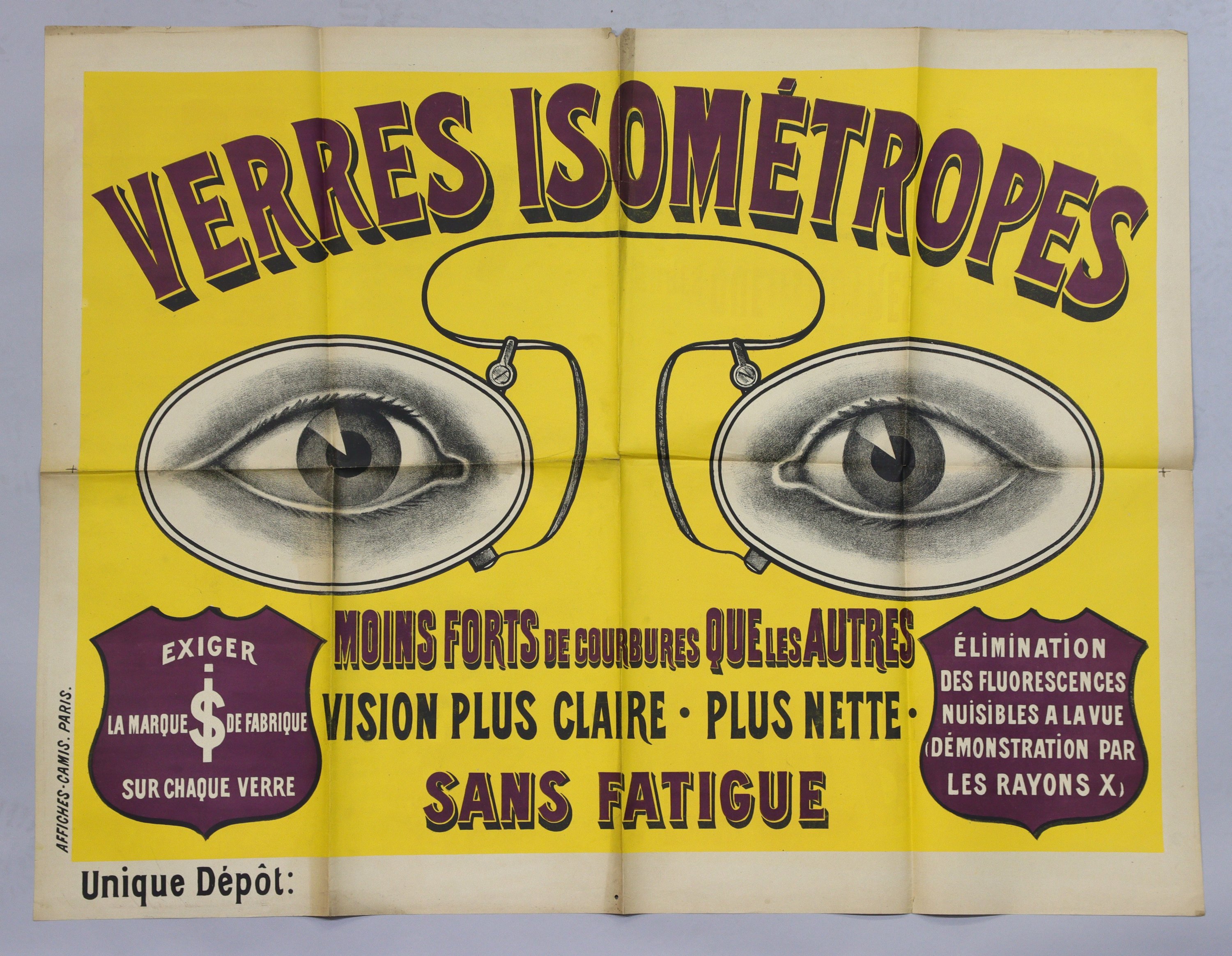 « VERRES ISOMETROPES / Vision plus claire plus nette sans fatigue ». Vers 1898. Env. 100 x 130 cm (plis, petites déchirures dans les plis et rousseurs/salissures) ;