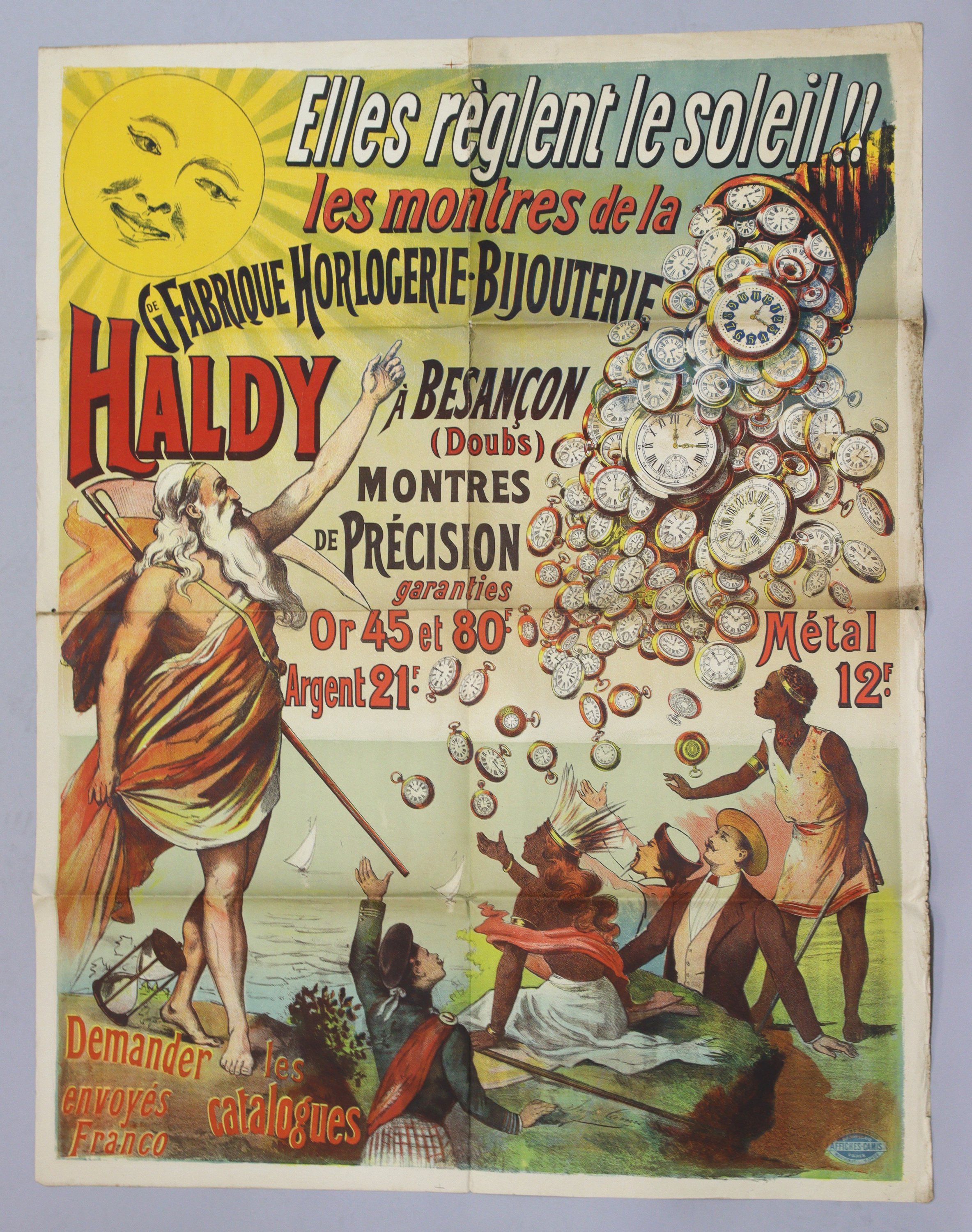 « HALDY / Elles règlent le soleil!! Les montres de la Gde fabrique horlogerie bijouterie à Besançon ». Vers 1898. Env. 130 x 100 cm (plis, petites déchirures, rousseurs/salissures) ;