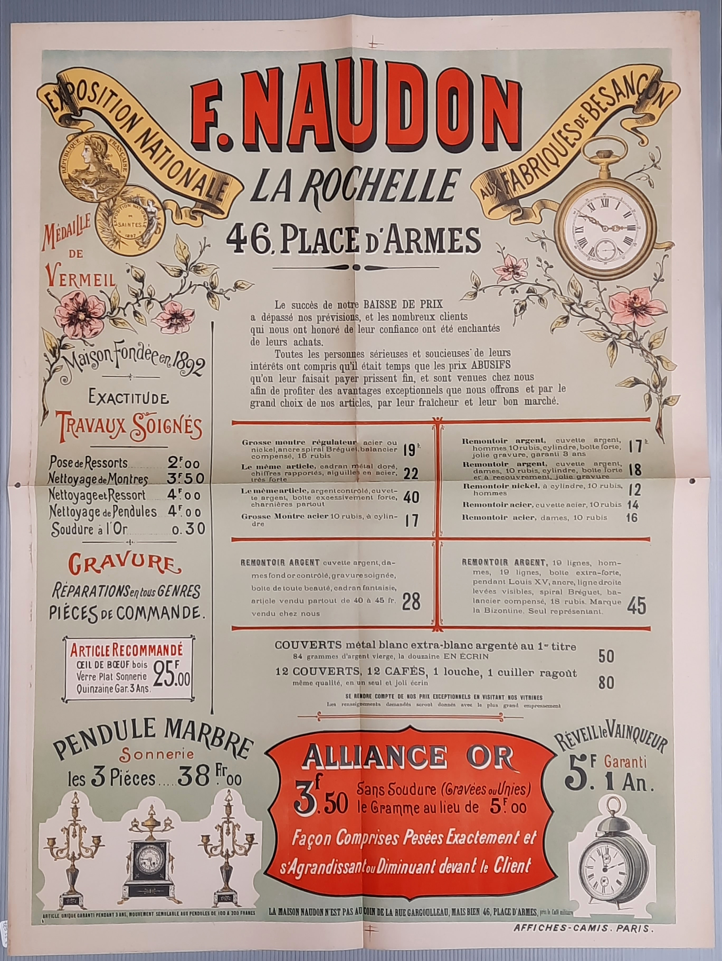 « F. NAUDON La Rochelle 46 place darmes ». Vers 1898. Env. 80 x 60 cm (plis). Bel exemplaire ;