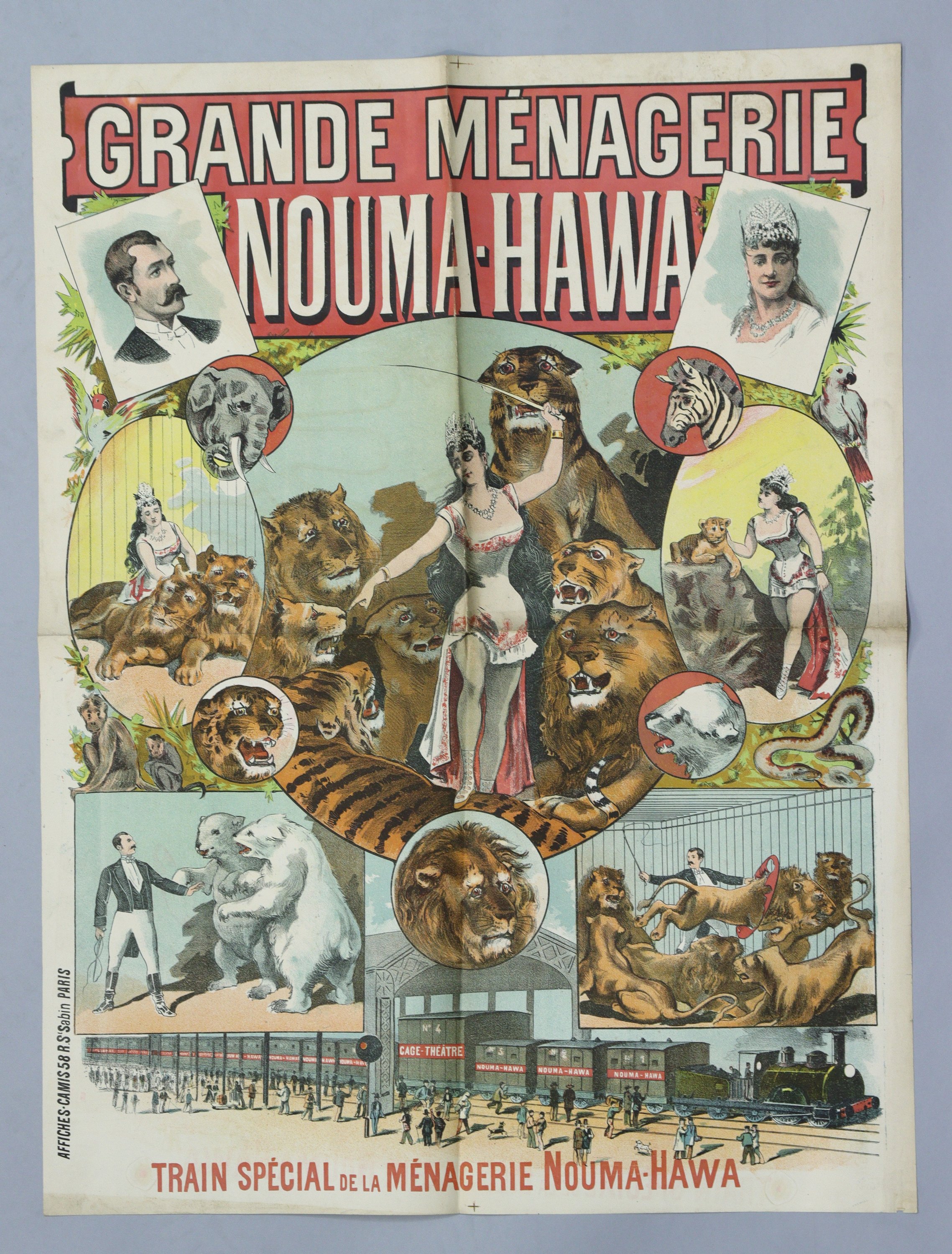 « GRANDE MENAGERIE NOUMA-HAWA / Train spécial de la ménagerie ». Vers 1898. 80 x 60 cm (plis, rousseurs/salissures).