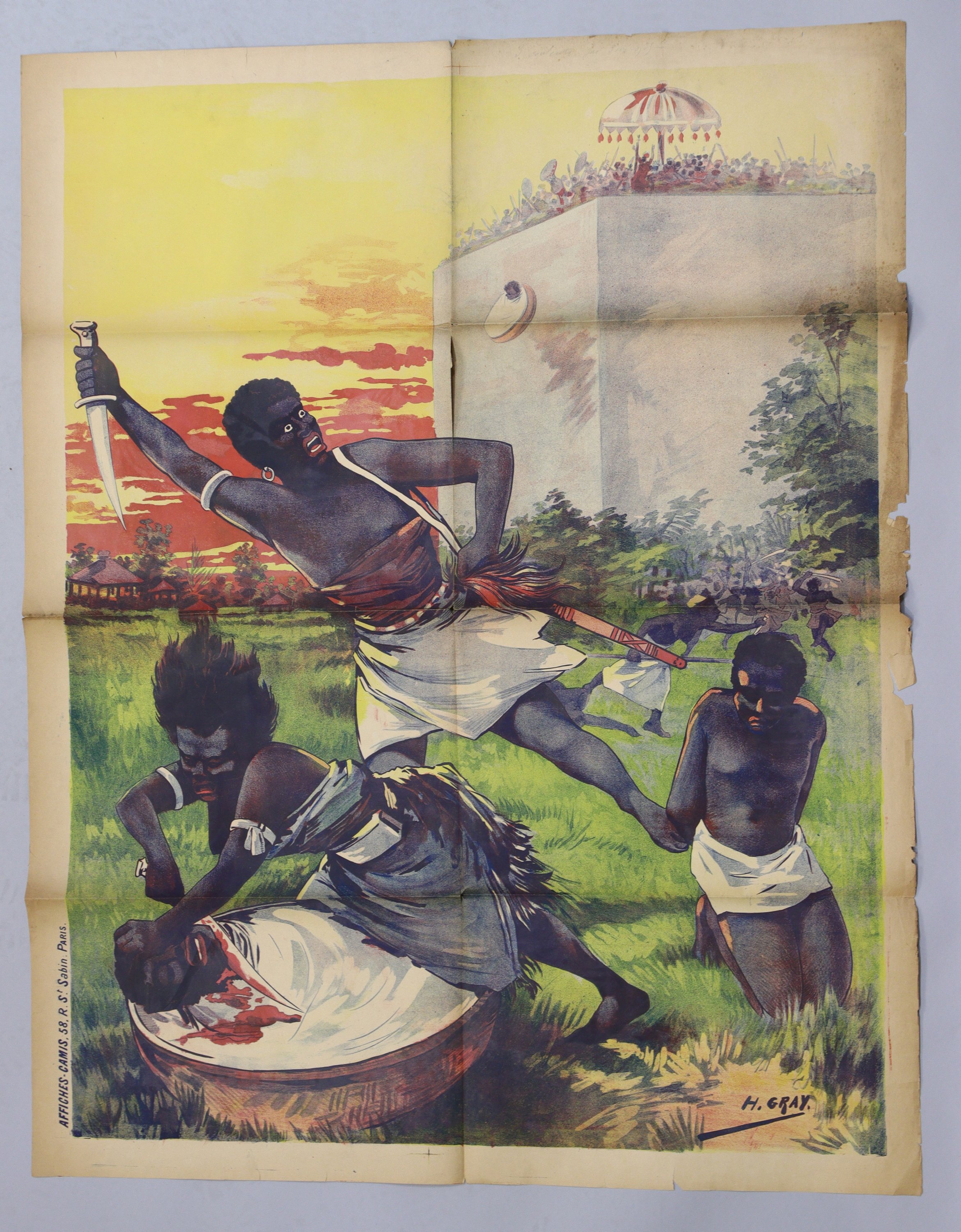 [Exposition d’ethnographie coloniale, Champ de Mars, palais des arts libéraux, 150 dahoméens]. [1893]. Affiche avant la lettre. Signée. Env. 128 x 100 cm (plis, déchirures, manque en marge, rousseurs/salissures) ;