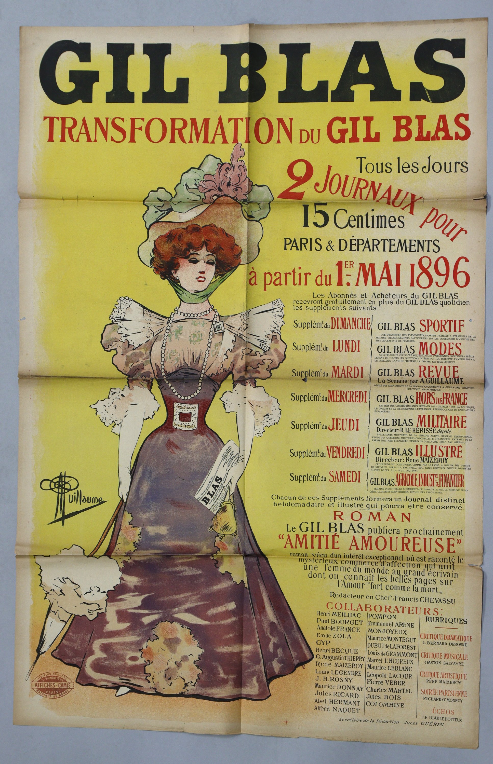 « GIL BLAS / Transformation du Gil Blas / Tous les jours 2 journaux ». Signée. 1896. Env. 140 x 90 cm (plis, petites déchirures, rousseurs/salissures) ;
