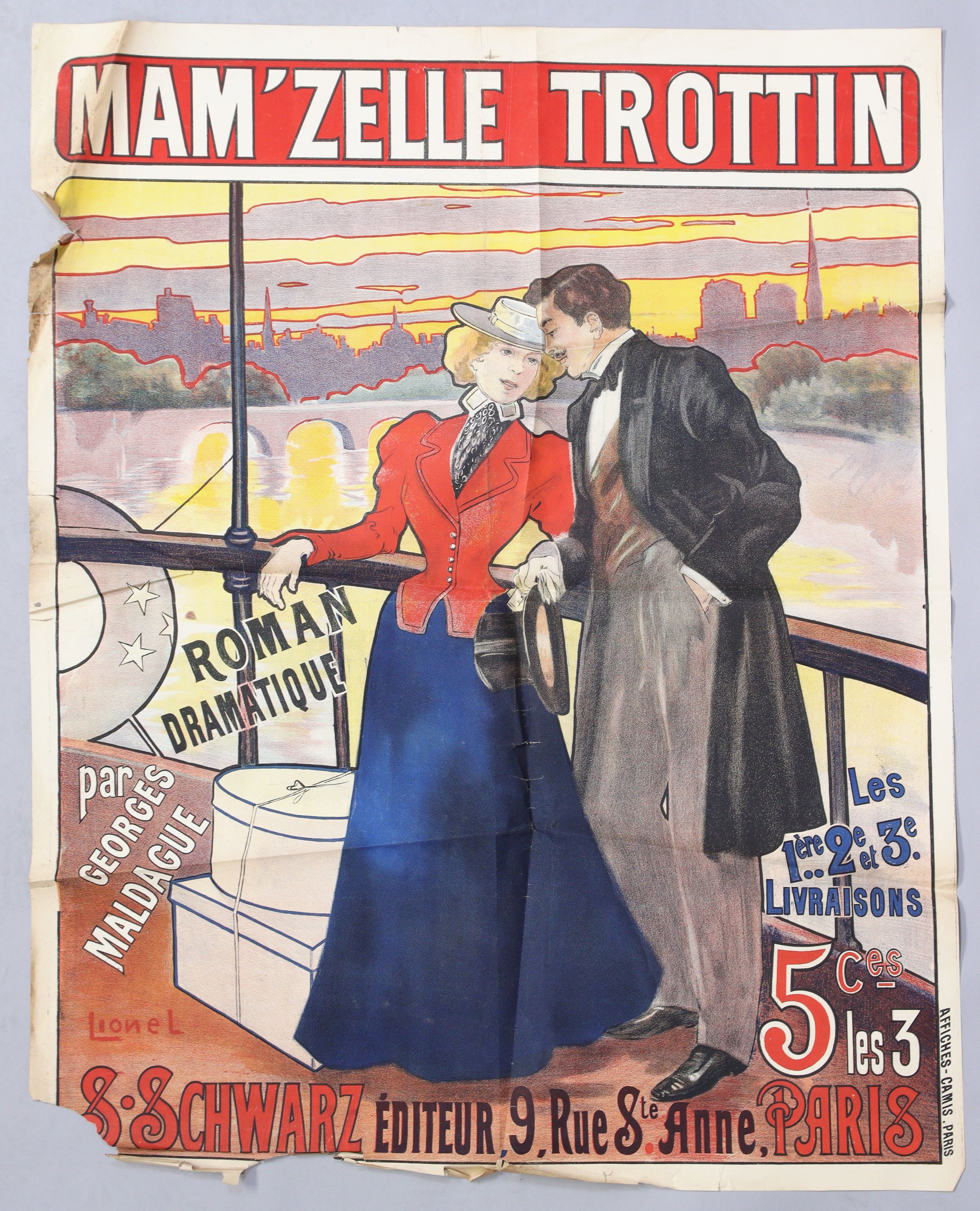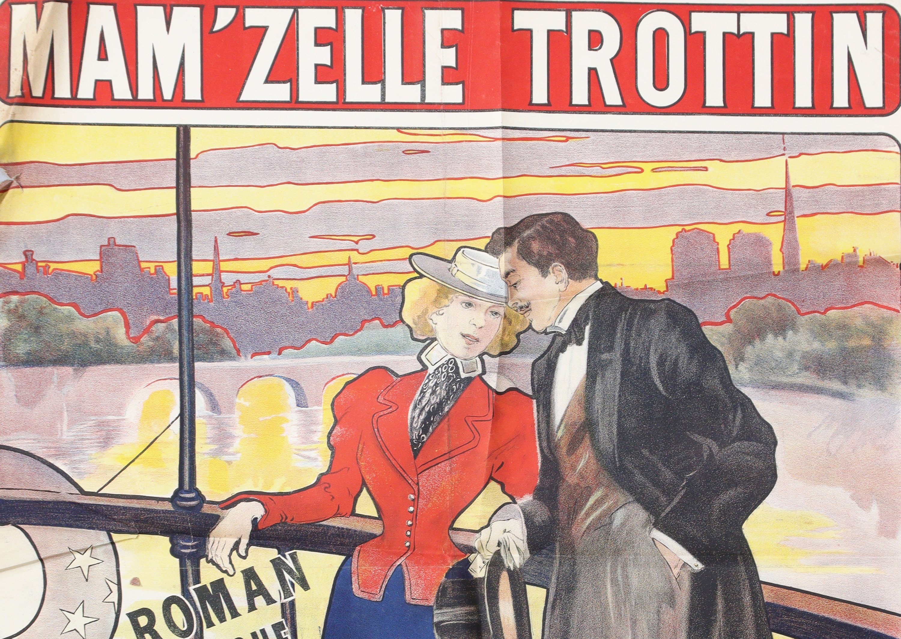 « MAMZELLE TROTTIN / Roman dramatique par Georges Malague ». Signée. Vers 1898. Env. 130 x 100 cm. En létat (plis, déchirures, manques, rousseurs/salissures) ;