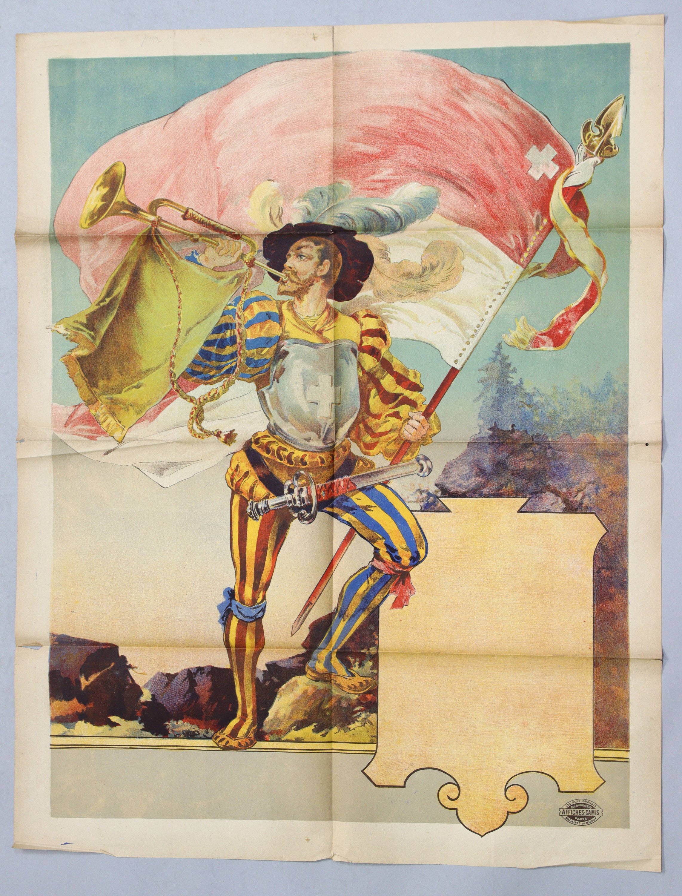 Garde trompette et porte étendard de Savoie. Affiche avant la lettre. Signées. 3 exemplaires. Vers 1898. Env. 190 x 124 cm (plis, petites déchirures, rousseurs/salissures).