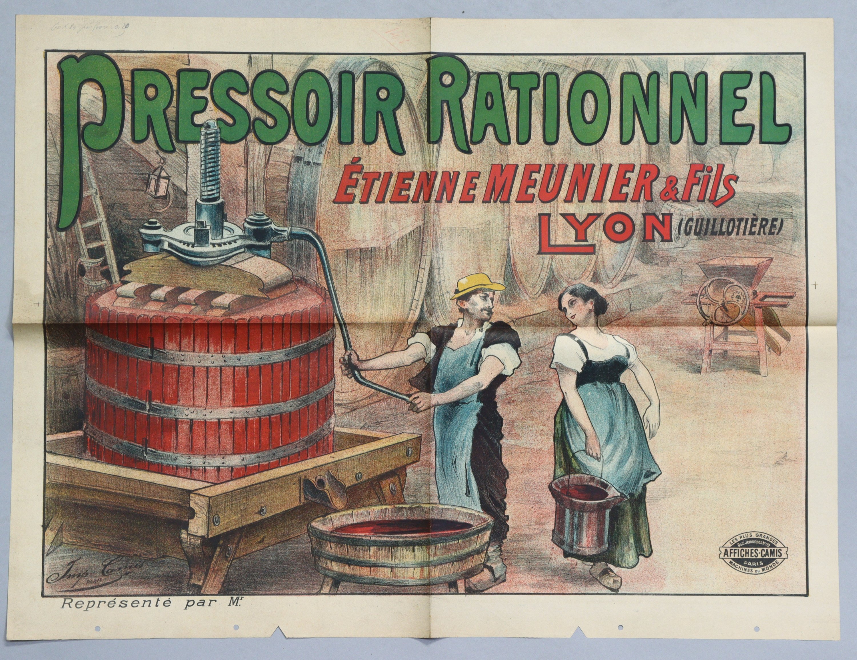 « PRESSOIR RATIONNEL / Etienne Meunier & fils Lyon (Guillotière) ». Vers 1898. Env. 60 x 79 cm (plis, rousseurs/salissures) ;