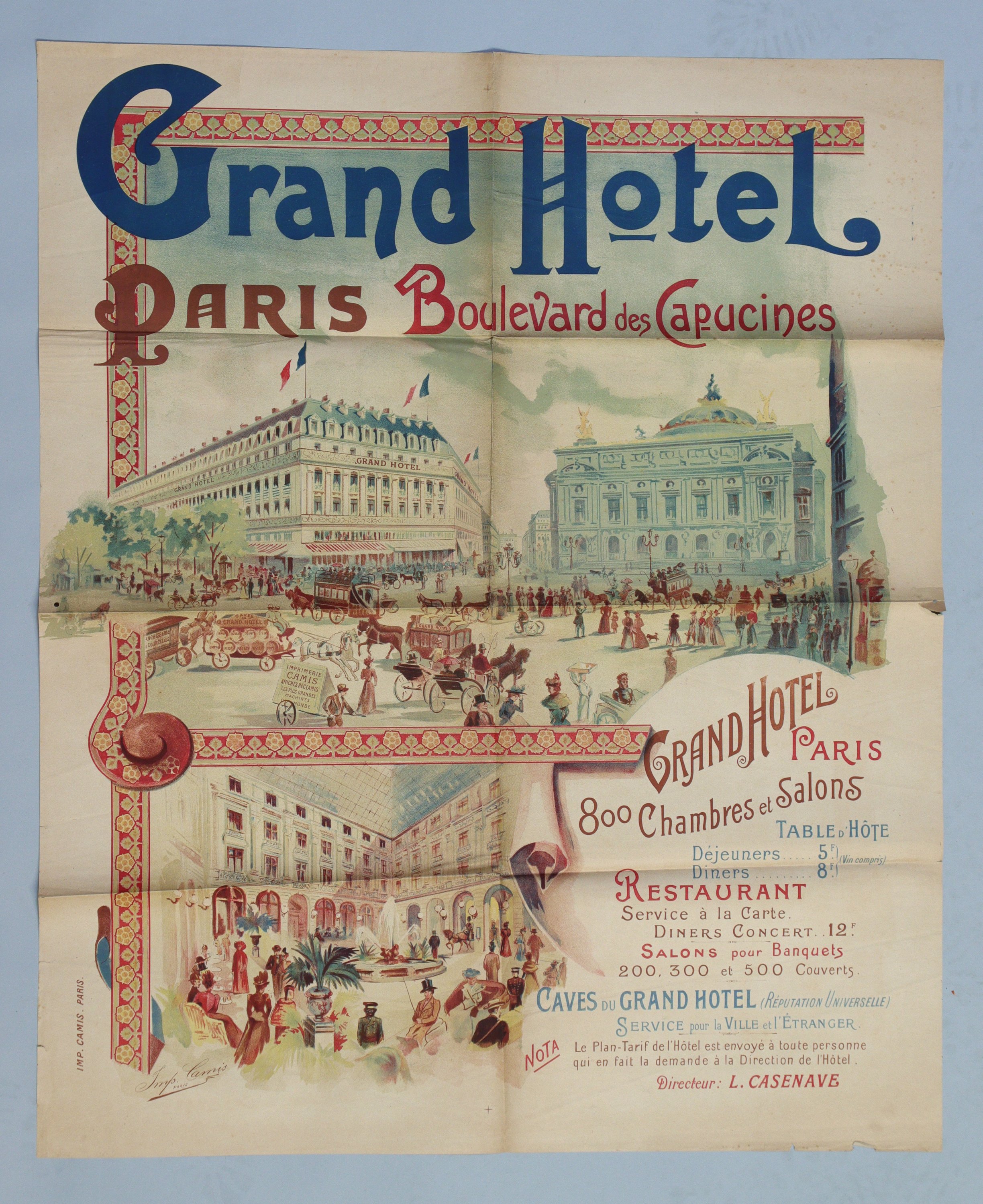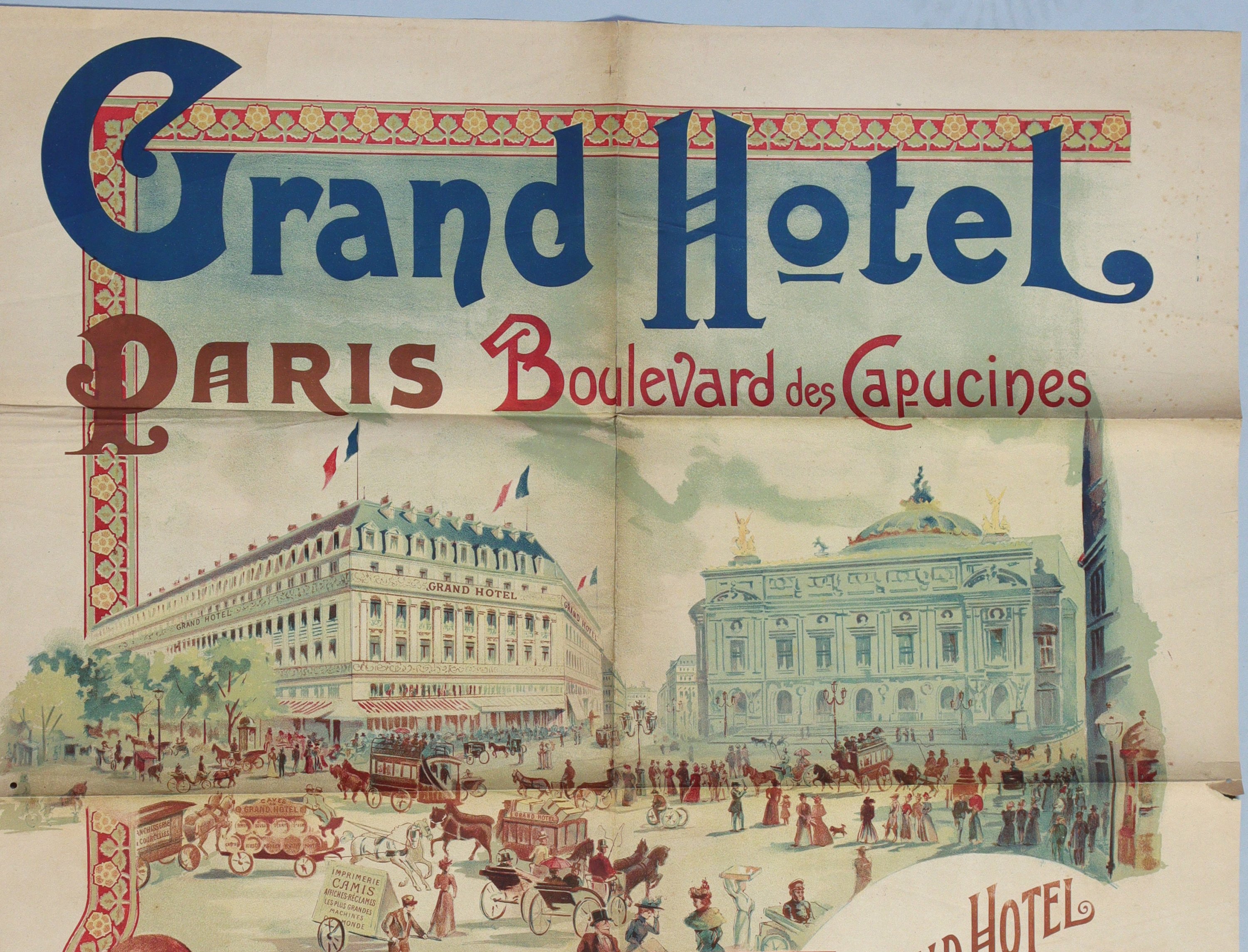 « Grand Hotel Paris Boulevard des Capucines ». Vers 1898. Env. 110 x 90 cm (plis, petites déchirures, rousseurs/salissures) ;