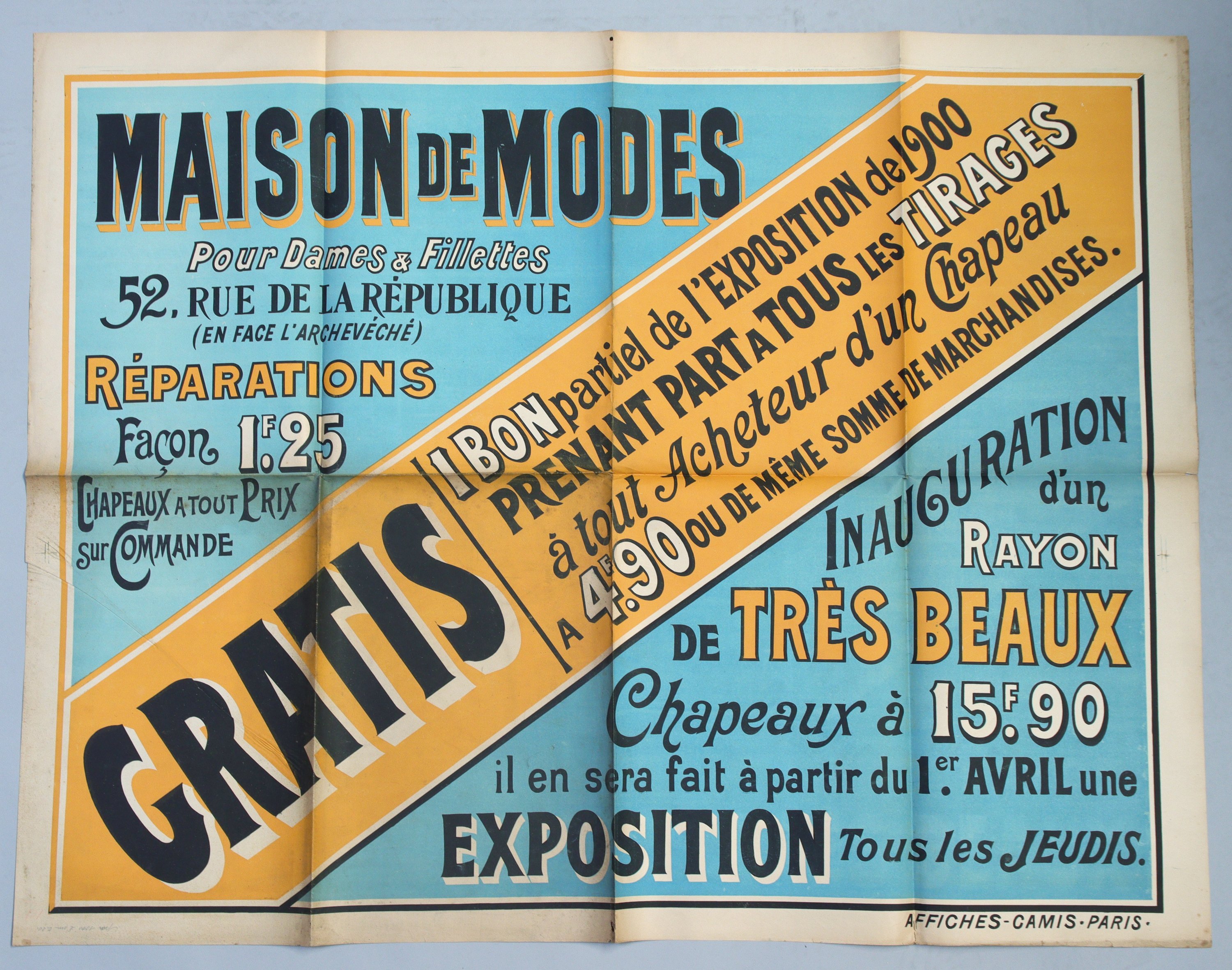 « MAISON DE MODES / pour dames & fillettes / 52, rue de la République ». Vers 1898. Env. 130 x 100 cm (plis, rousseurs/salissures) ;