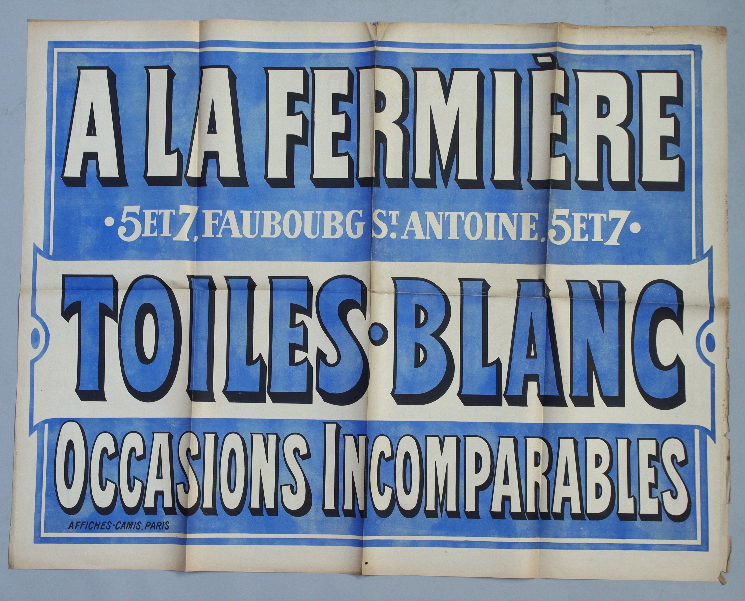 « A LA FERMIERE / 5 et 7 faubourg St Antoine / Toiles Blanc ». Vers 1898. 2 exemplaires. Env. 100 x 130 cm (plis, petites déchirures).