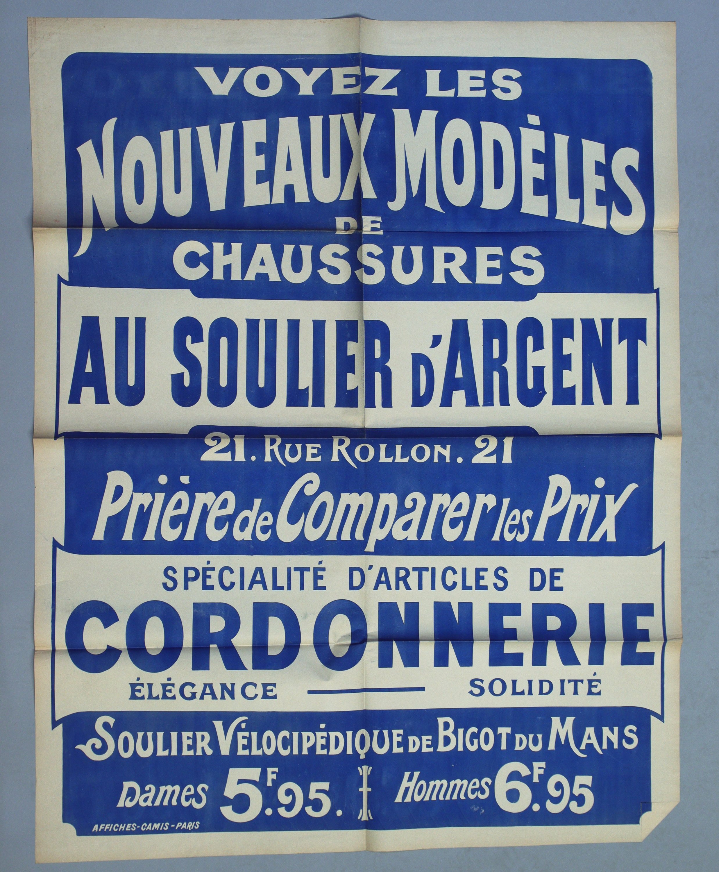 « AU SOULIER DARGENT / 21 rue Rollon / Spécialité darticles de cordonnerie ». Vers 1898. Env. 130 x 100 cm (plis, rousseurs/salissures) ;