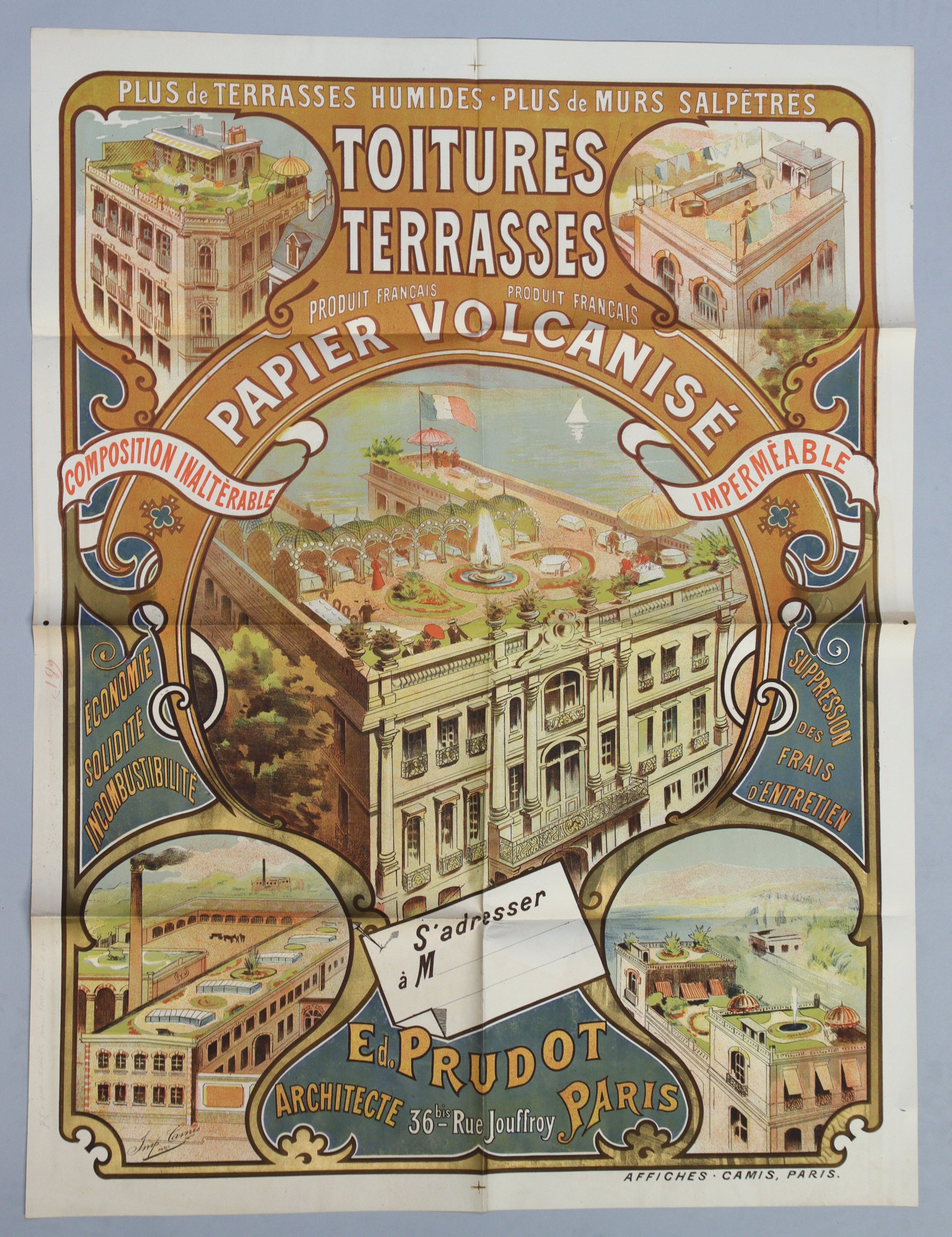 « Plus de terrasses humides, plus de murs salpêtres, toitures terrasses / PAPIER VOLCANISE / Ed. Prudot architecte Paris ». Vers 1898. Env. 100 x 75 cm (plis, rousseurs/salissures).