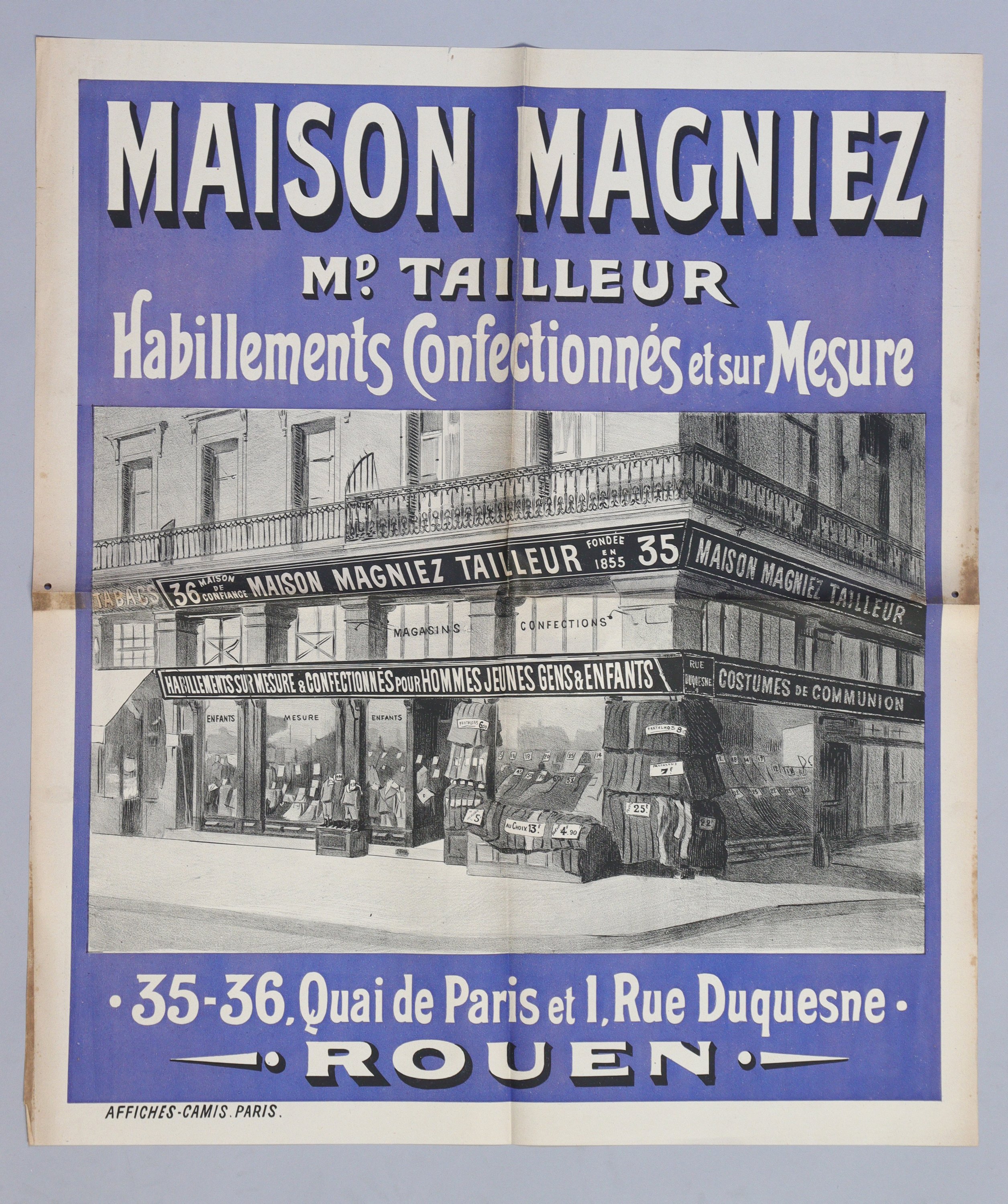 « MAISON MAGNIEZ Md tailleur / 30-36 quai de Paris et 1 rue Duquesne ROUEN ». Vers 1898. Env. 75 x 65 cm (plis, rousseurs/salissures) ;