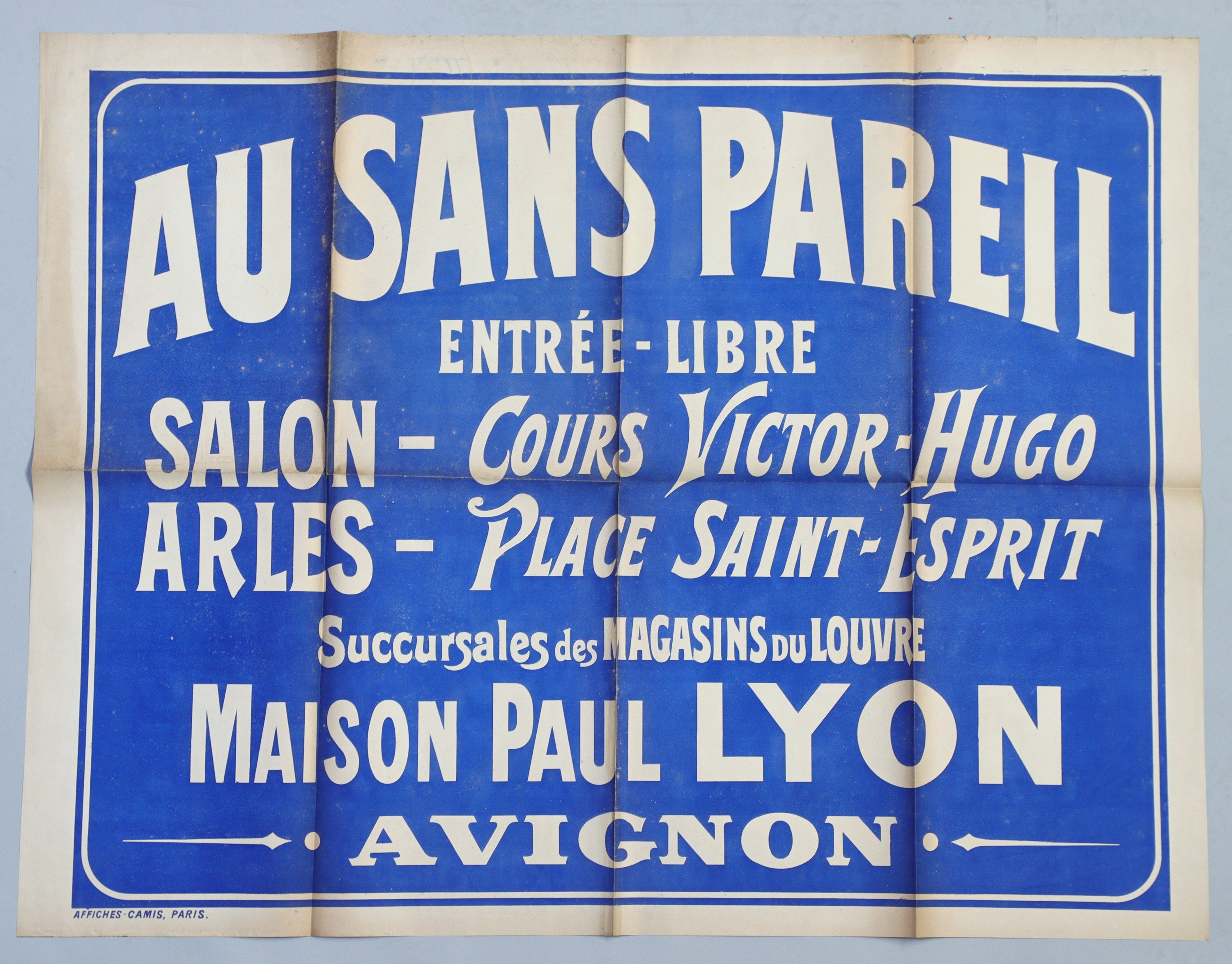 « AU SANS PAREIL / Succursales des magasins du Louvre / Salon, Arles, Maison Paul Lyon, Avignon ». Vers 1898. Env. 100 x 130 cm (plis, petites déchirures, rousseurs/salissures) ;