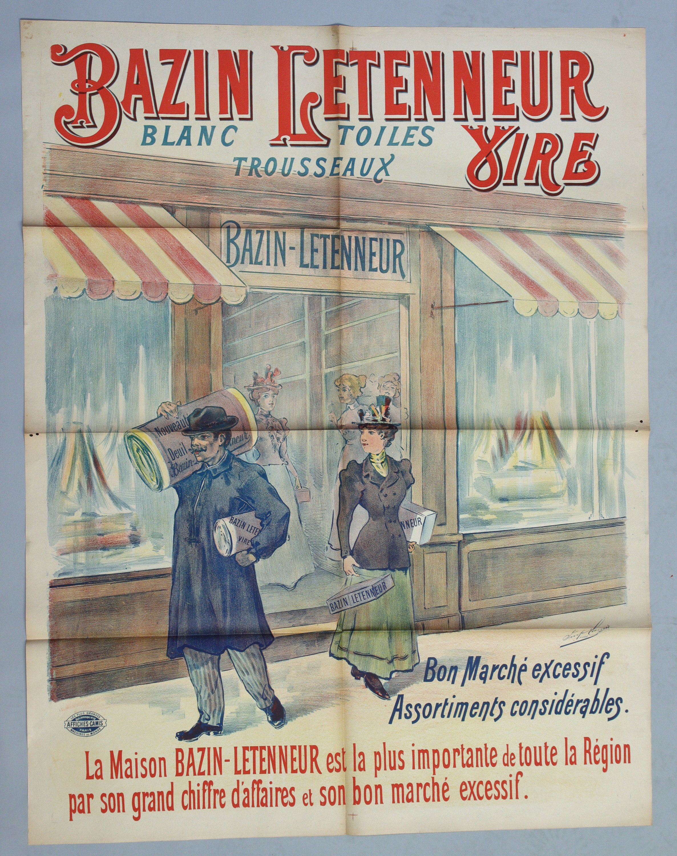 « BAZIN LETENNEUR / Blanc toiles trousseaux ». Vers 1898. Env. 130 x 100 cm (plis, rousseurs/salissures).