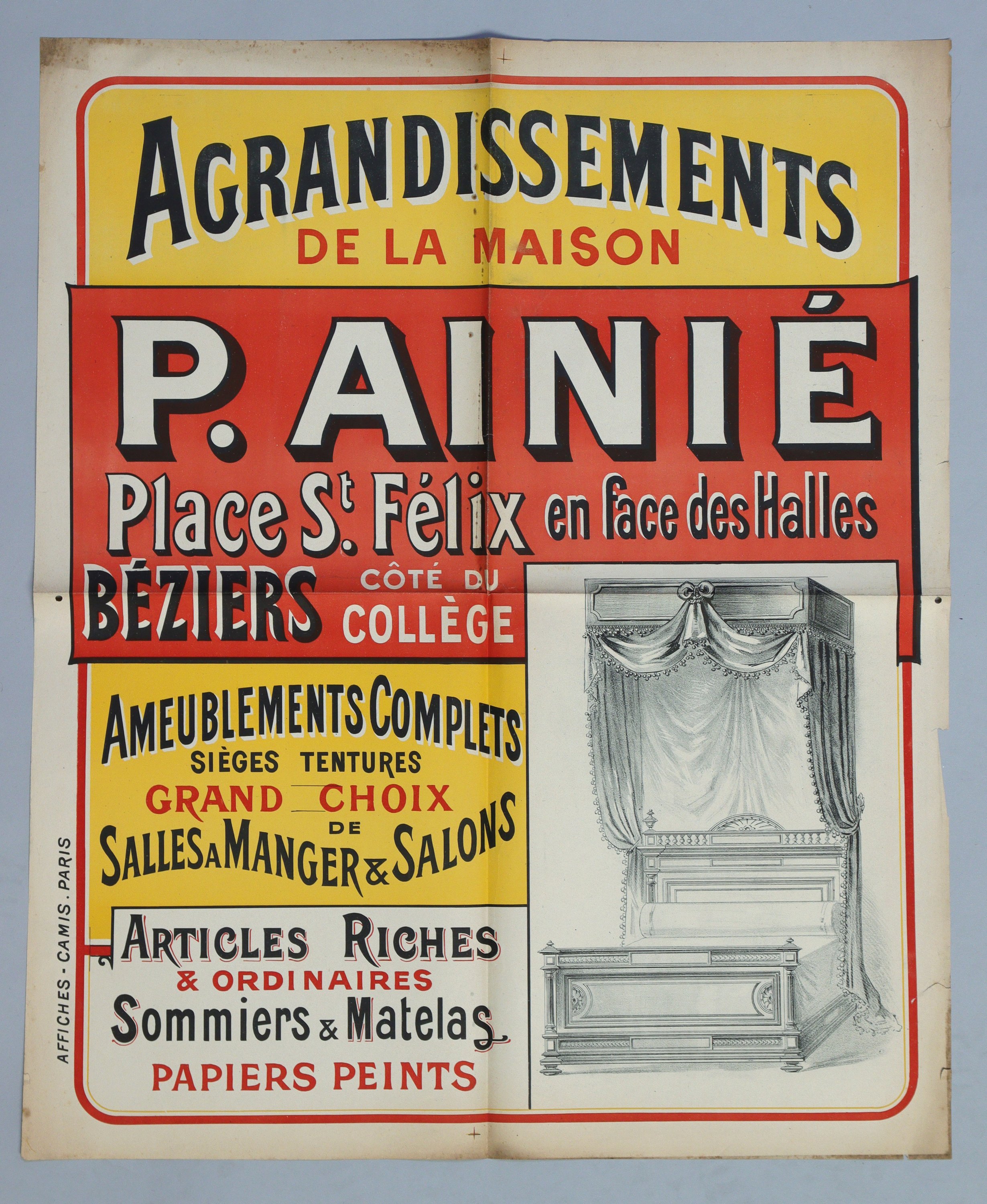 « Agrandissements de la maison P. AINIE place St Félix en face des halles BEZIERS / Ameublements complets, sièges, tentures ». Vers 1898. Env. 79 x 65 cm (plis, petites déchirures, rousseurs/salissures).