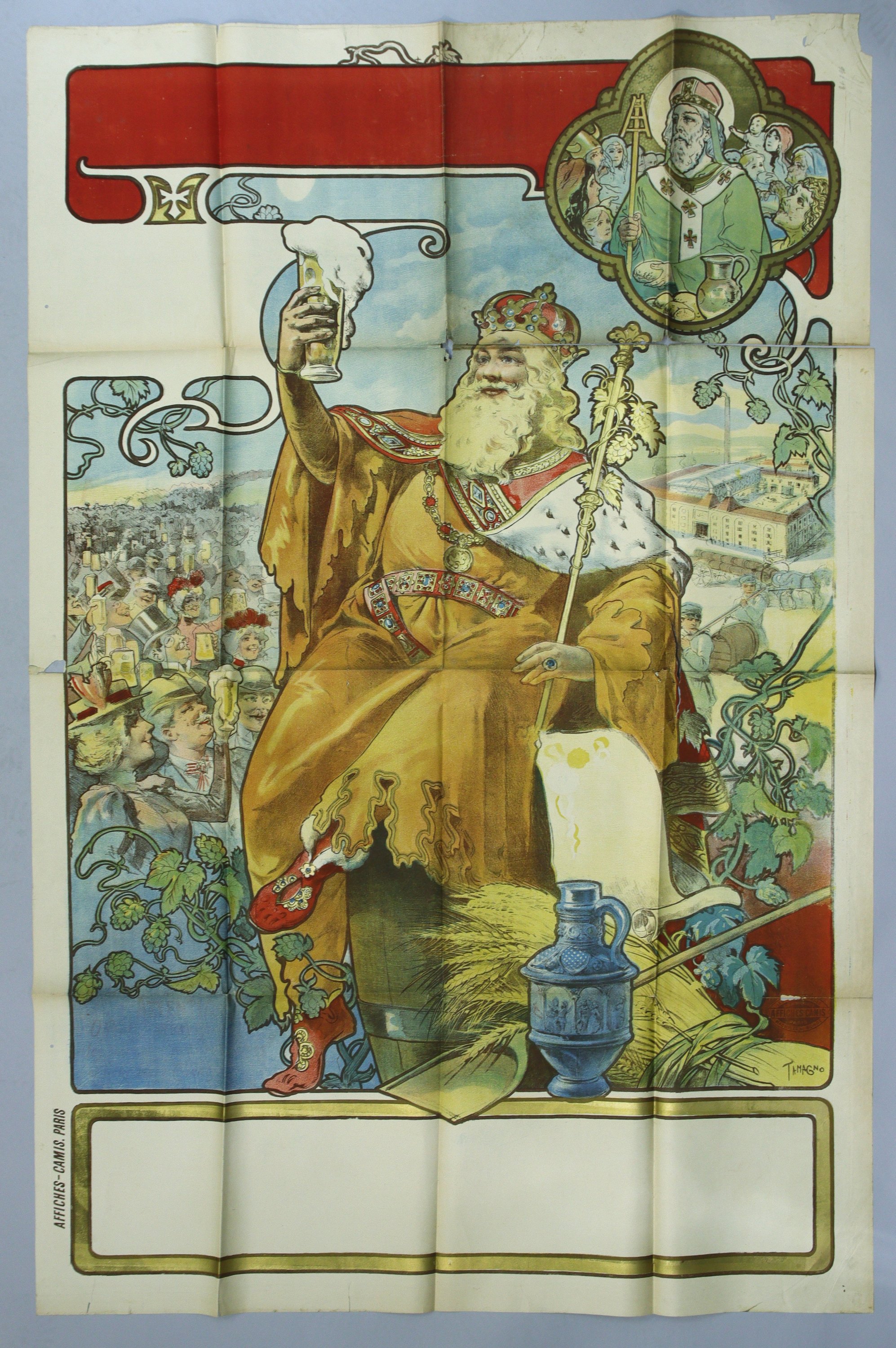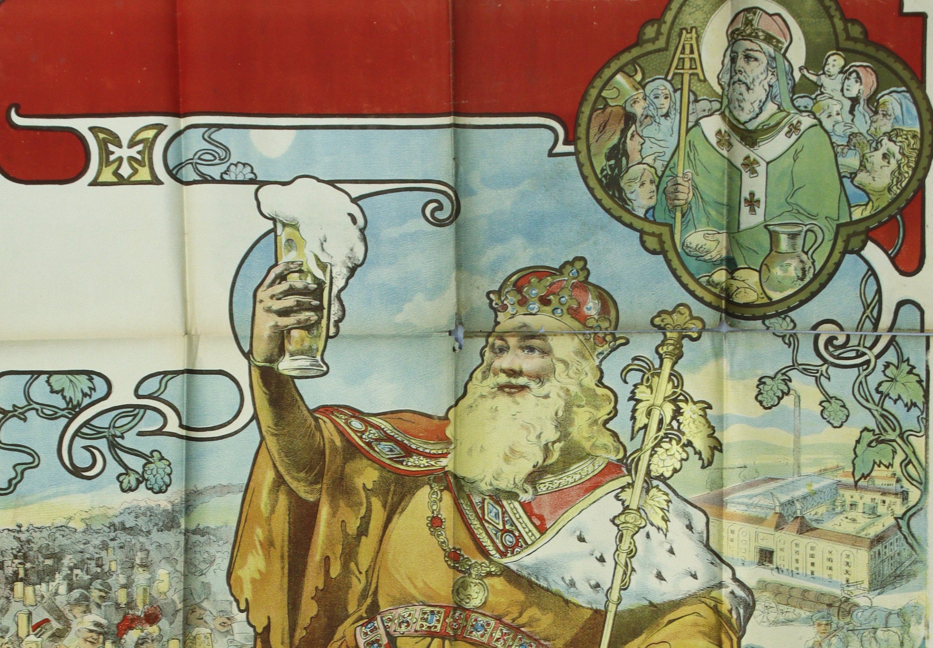 Grambinus, roi de Flandre et de Brabant symbole des amateurs de bière. Affiche avant la lettre. Signée. Env. 190 x 124 cm (plis, petites déchirures, rousseurs/salissures) ;