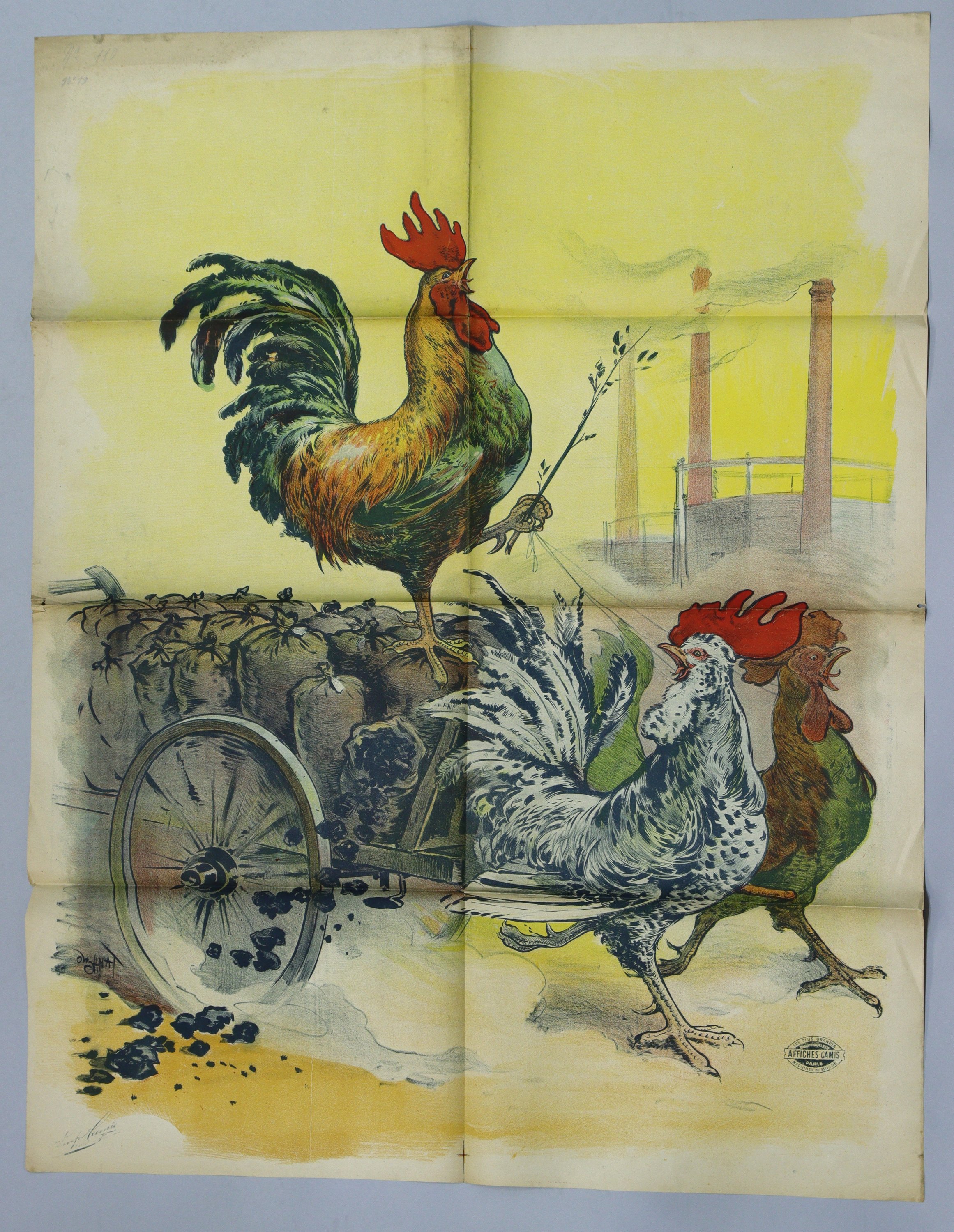 Chargement de coke de charbon tiré par des coqs. Affiche avant la lettre. Signée. Env. 130 x 100 cm (plis, petites déchirures, rousseurs/salissures) ;