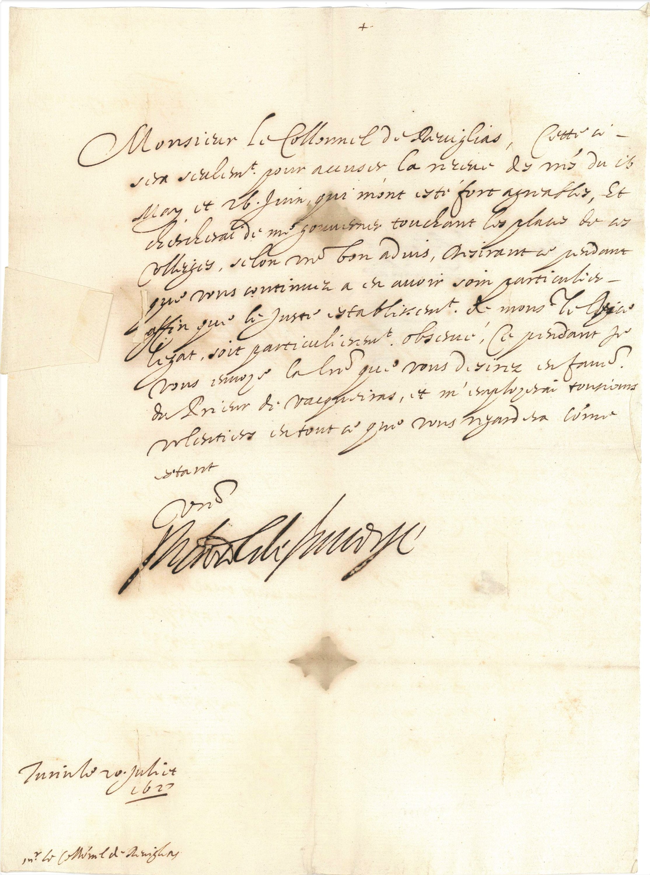 L.S., Turin, 20 juillet 1620, Maurice de Savoie (1593-1657), cardinal évêque de Verceil ou Vercelli, adresse et sceau, 1 page in-4 ; missive adressée au colonel de Revigliasc, relative au collège dAvignon.