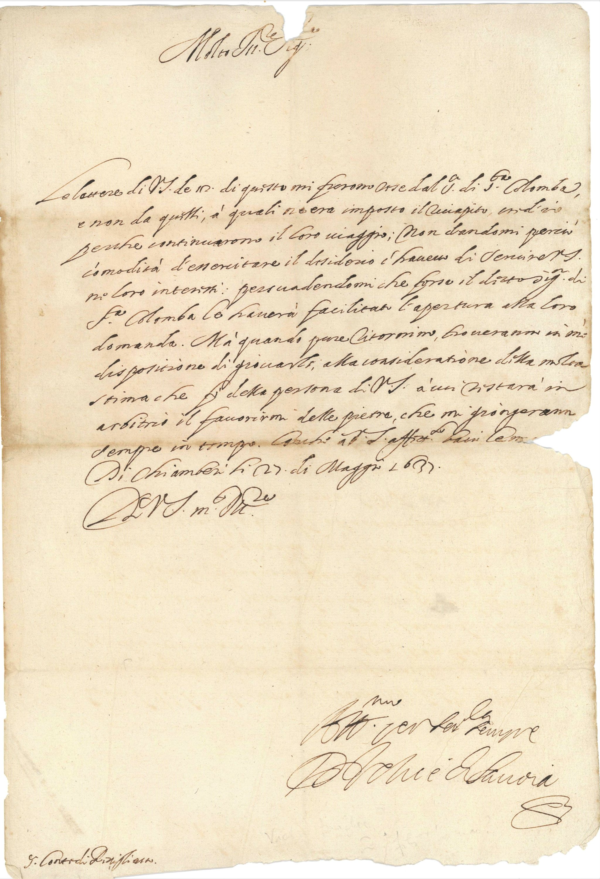 Joint : L.S. (en italien), Chambéry, 27 mai 1637, adressée au comte de Revigliasc, 1 page in-fol.