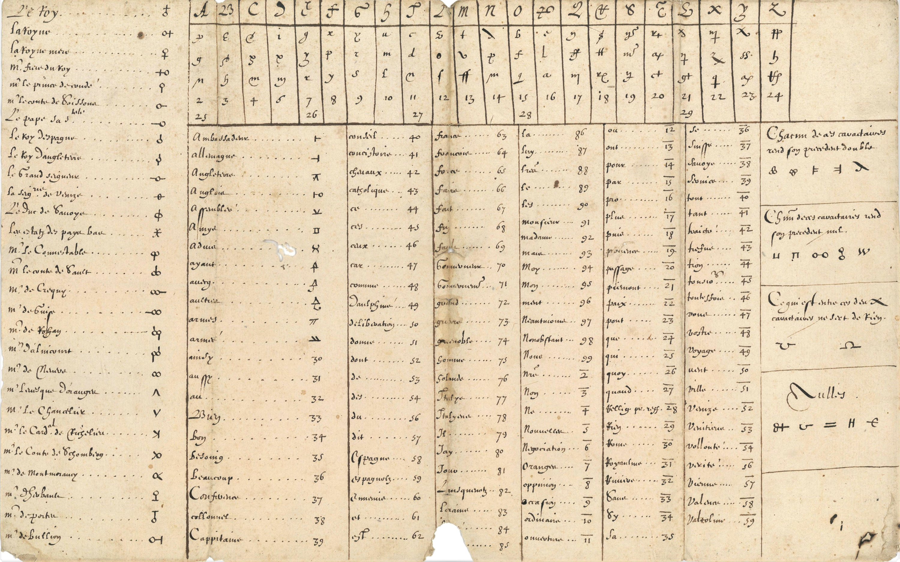 Chifre de M. dHerbault, vers 1625-1630, manuscrit 1 page in-4 ; rarissime table de chiffrement manuscrite ayant appartenu à Jean de Tulle, évêque dOrange, en relation secrète avec le secrétaire détat du roi Raymond Phélypeaux dHerbault, dans le cadre des négociations du traité de Valkenbourg ;