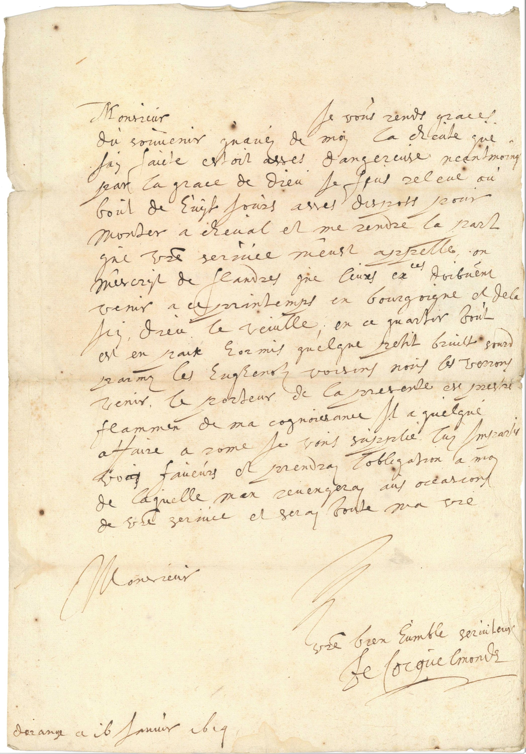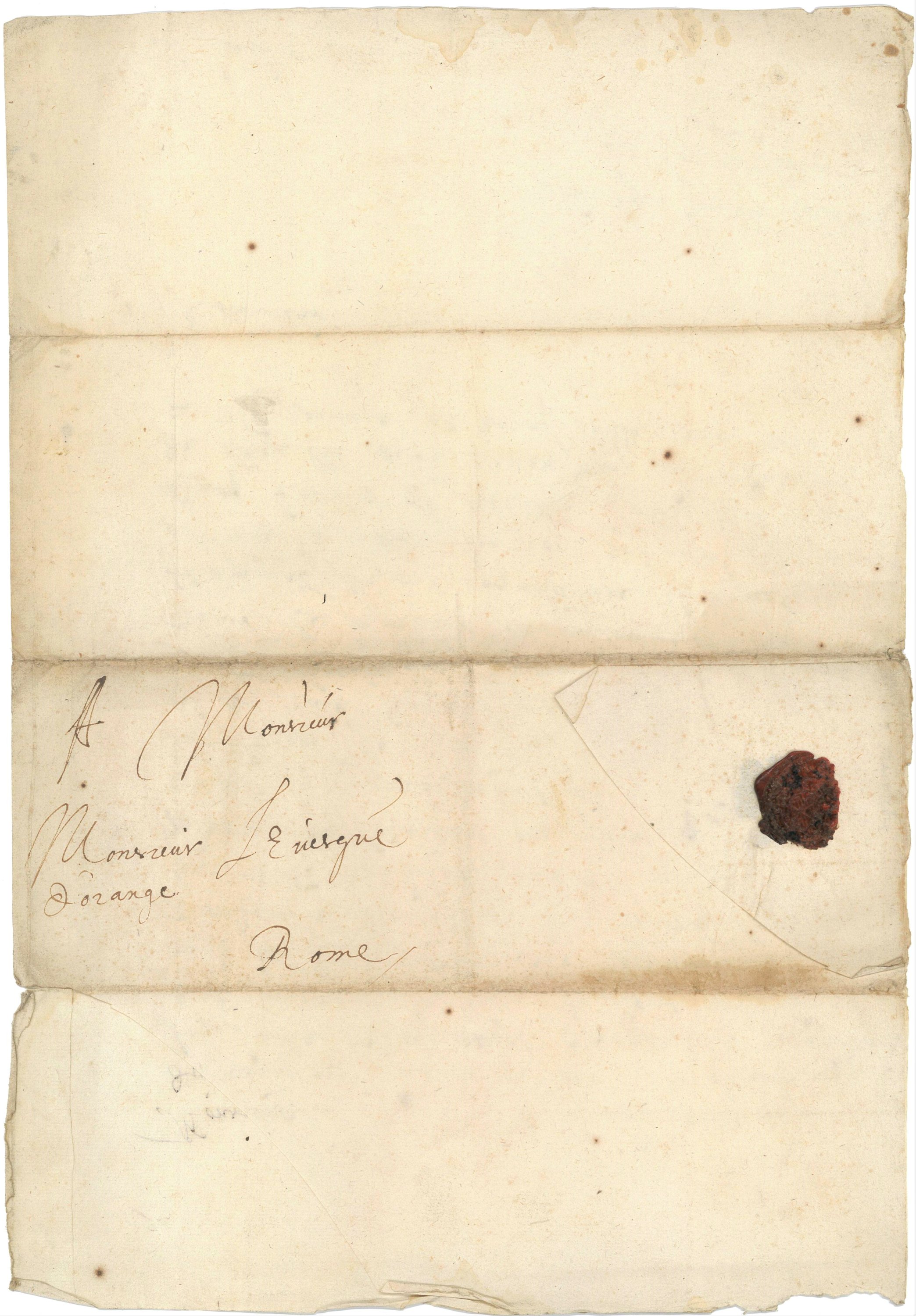 L.A.S., Orange, 16 janvier 1614, Jean de Grysperre, seigneur de Cocquelmonde, gouverneur dOrange, adressée à Jean II de Tulle, évêque dOrange, à Rome, adresse et sceau de cire rouge, 1 page in-fol.