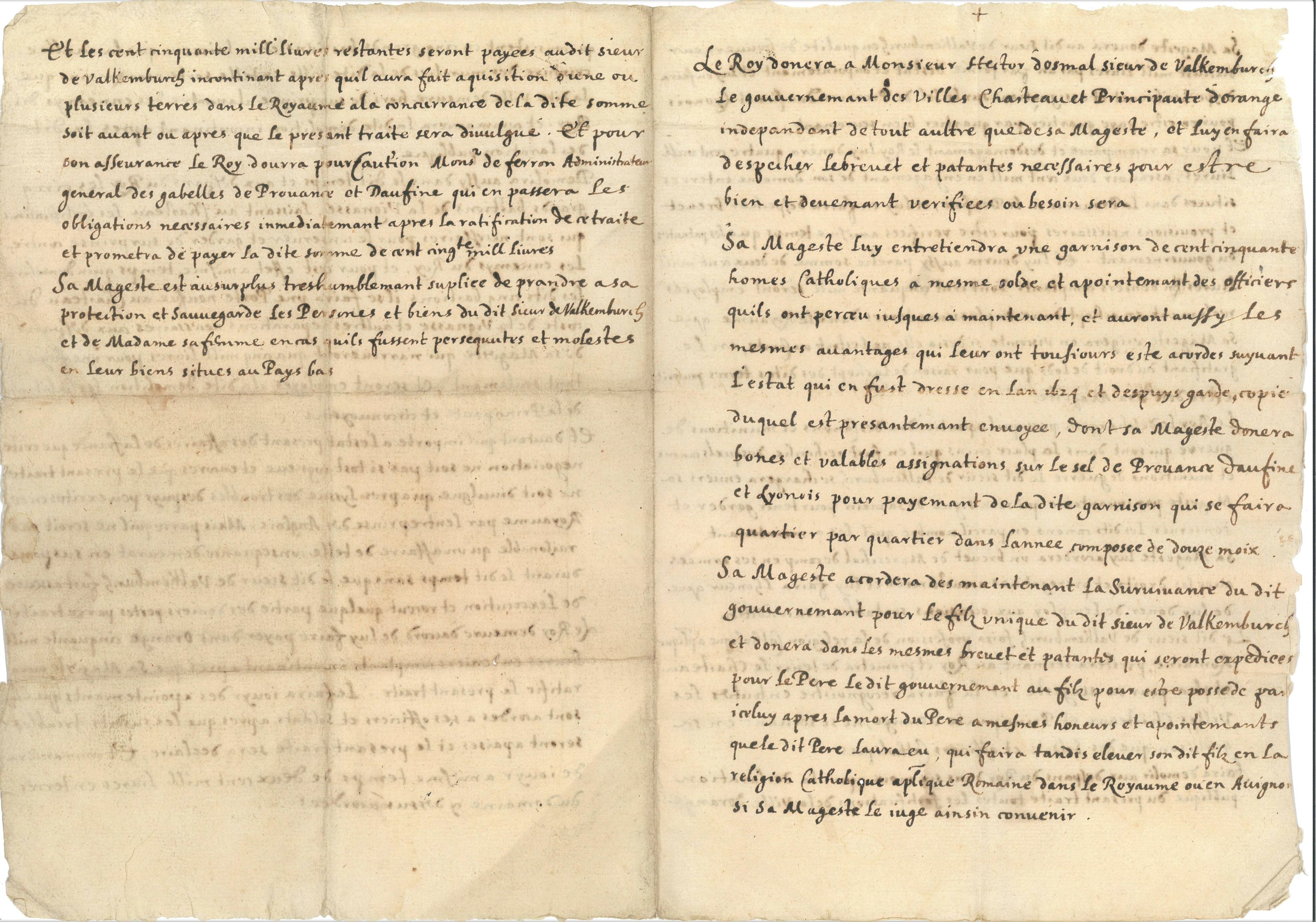 Copie manuscrite dépoque du traité secret passé entre le roi Louis XIII et le gouverneur de la principauté dOrange Jean Hertoge dOsmael, seigneur de Valkenbourg, ratifié le 15 décembre 1627 et approuvé le 6 avril 1628, 4 pages in-4