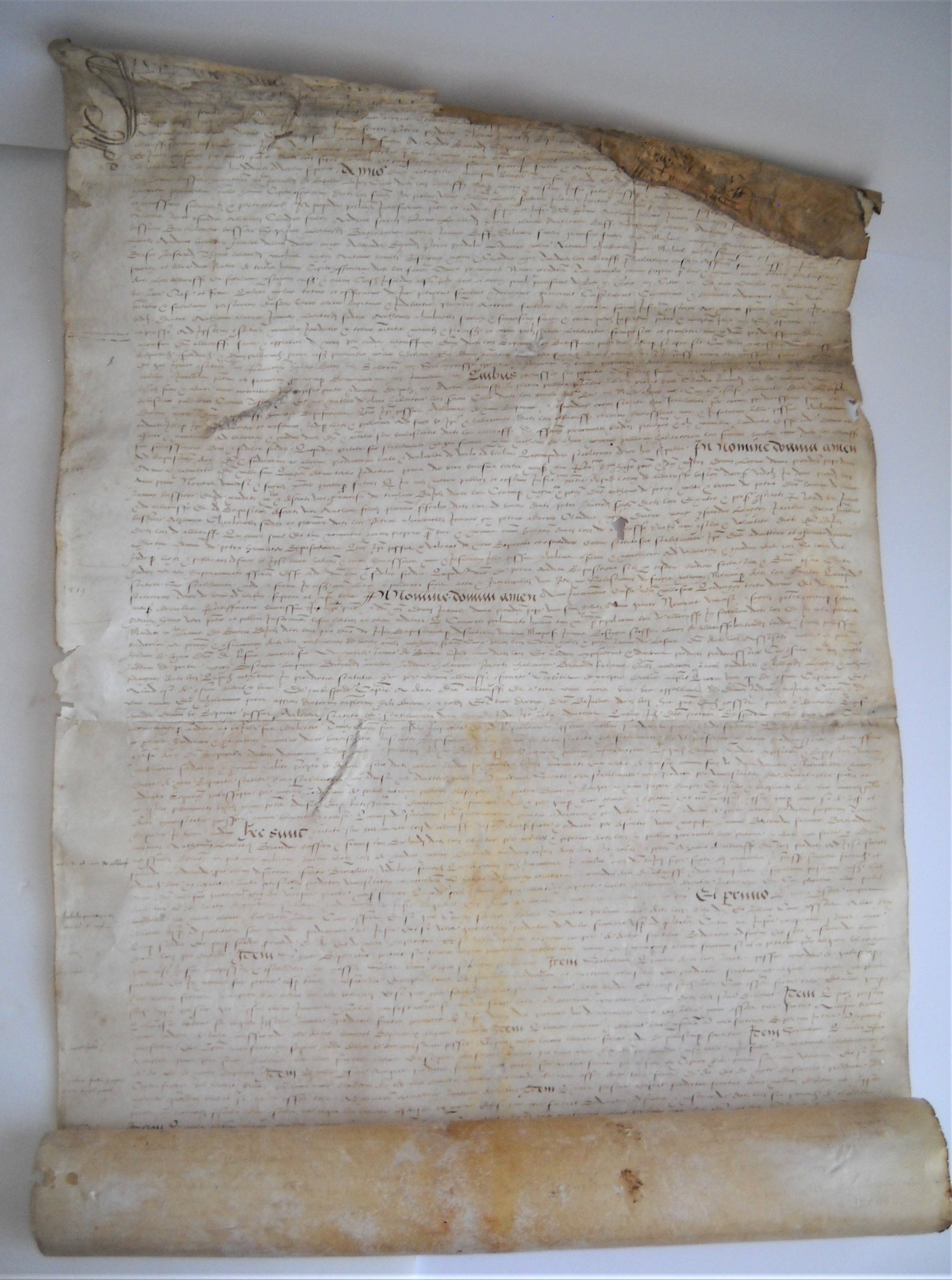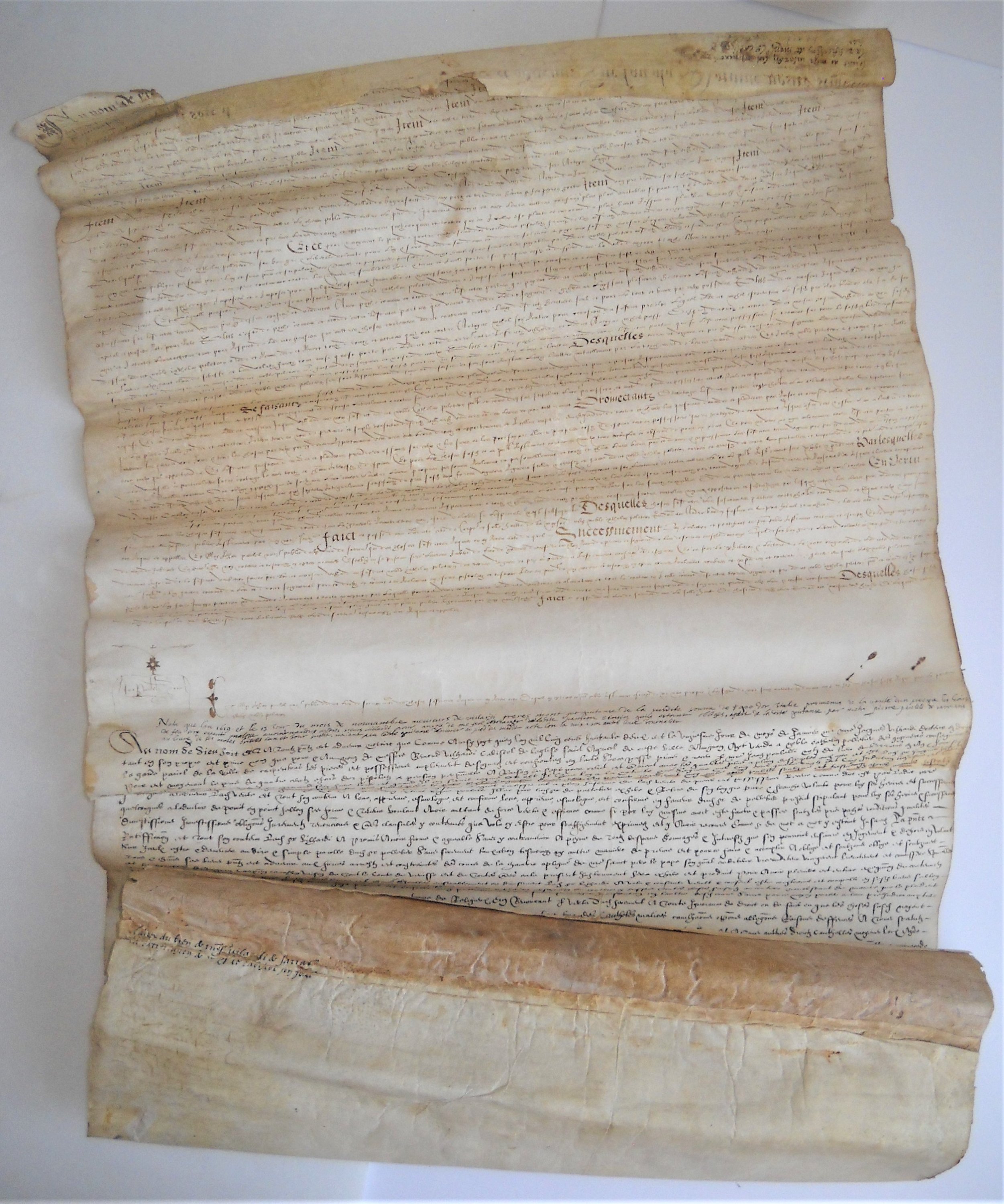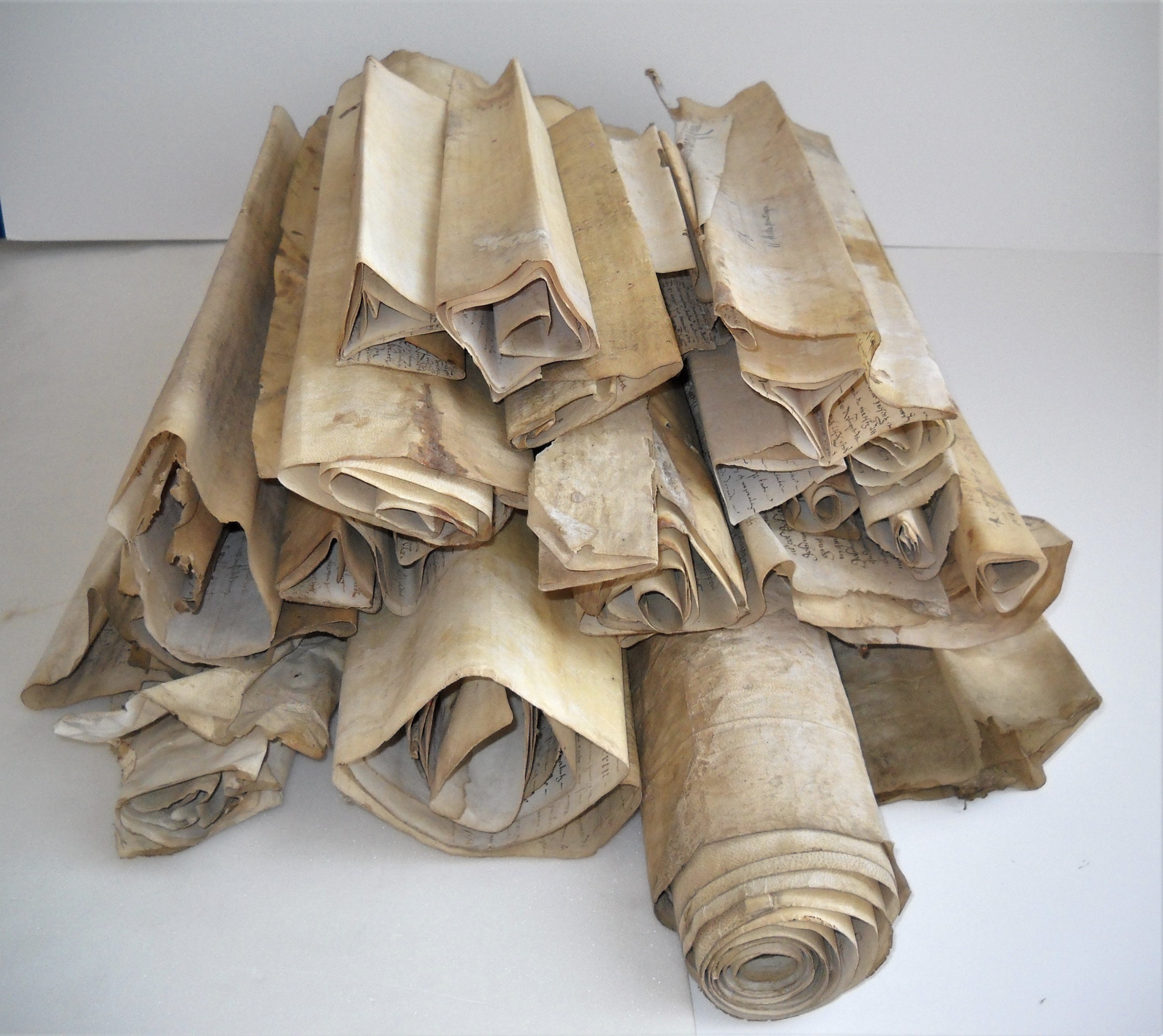 Lot de 24 parchemins roulés ou pliés, 14e au 16e siècle, formats et états divers.