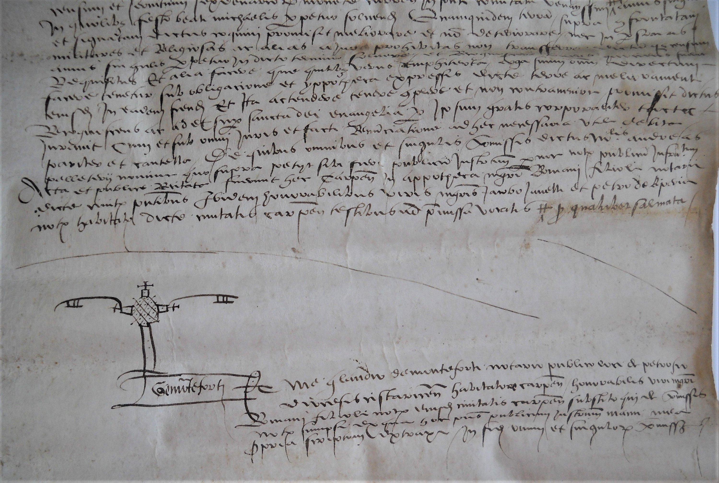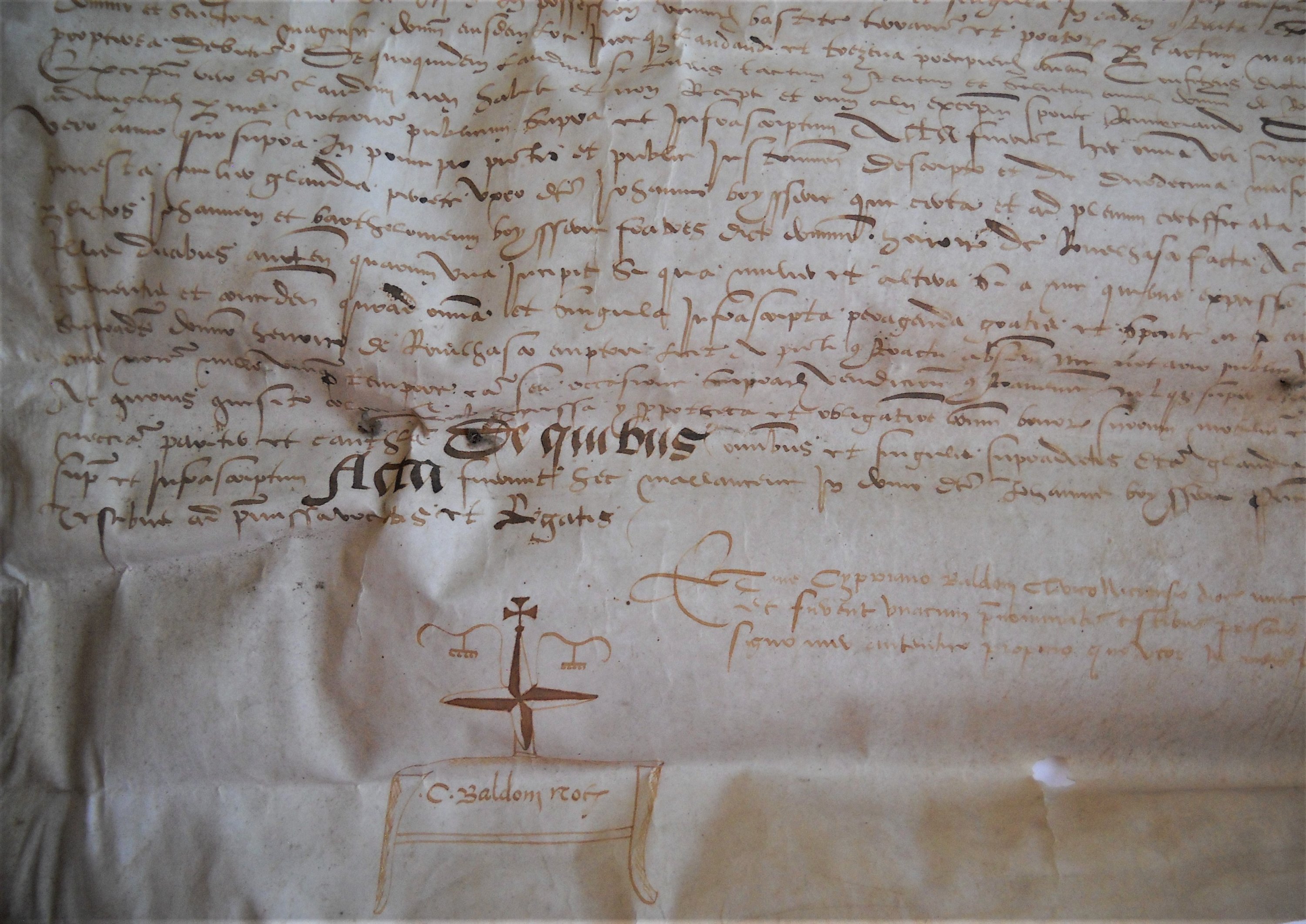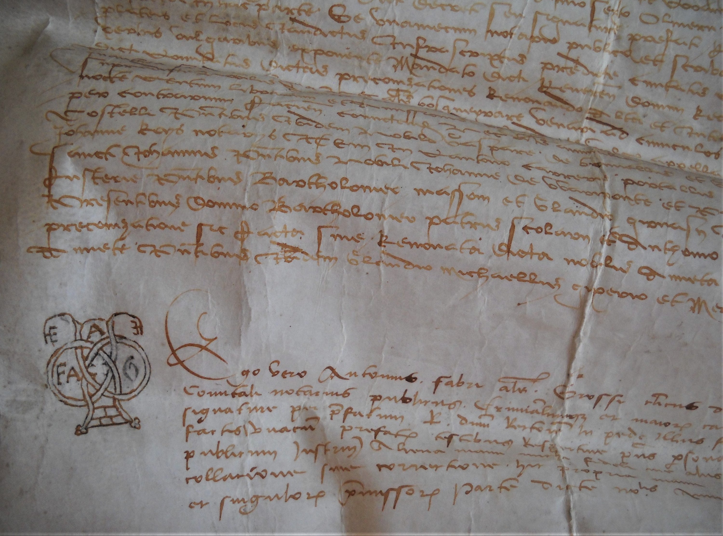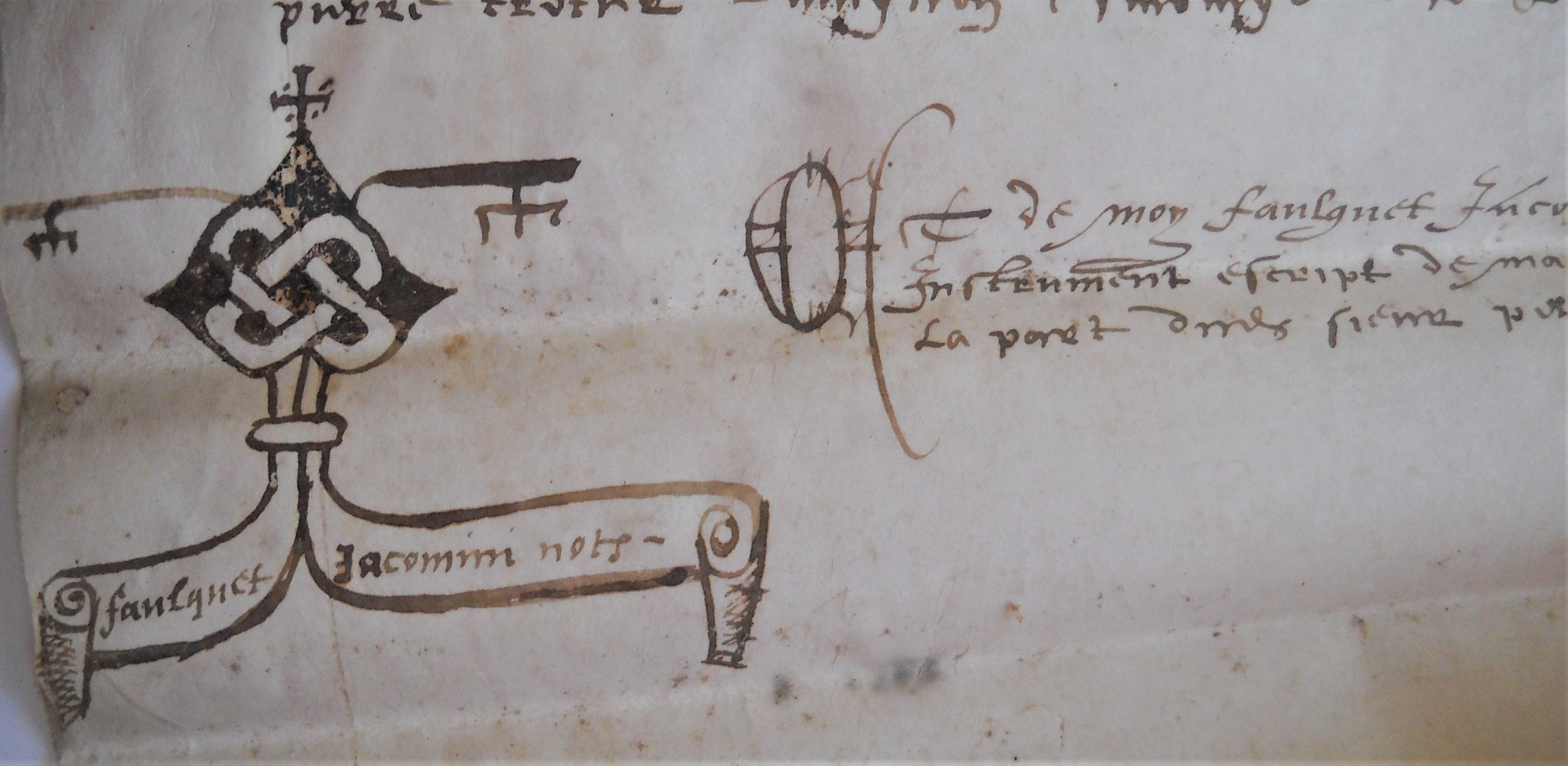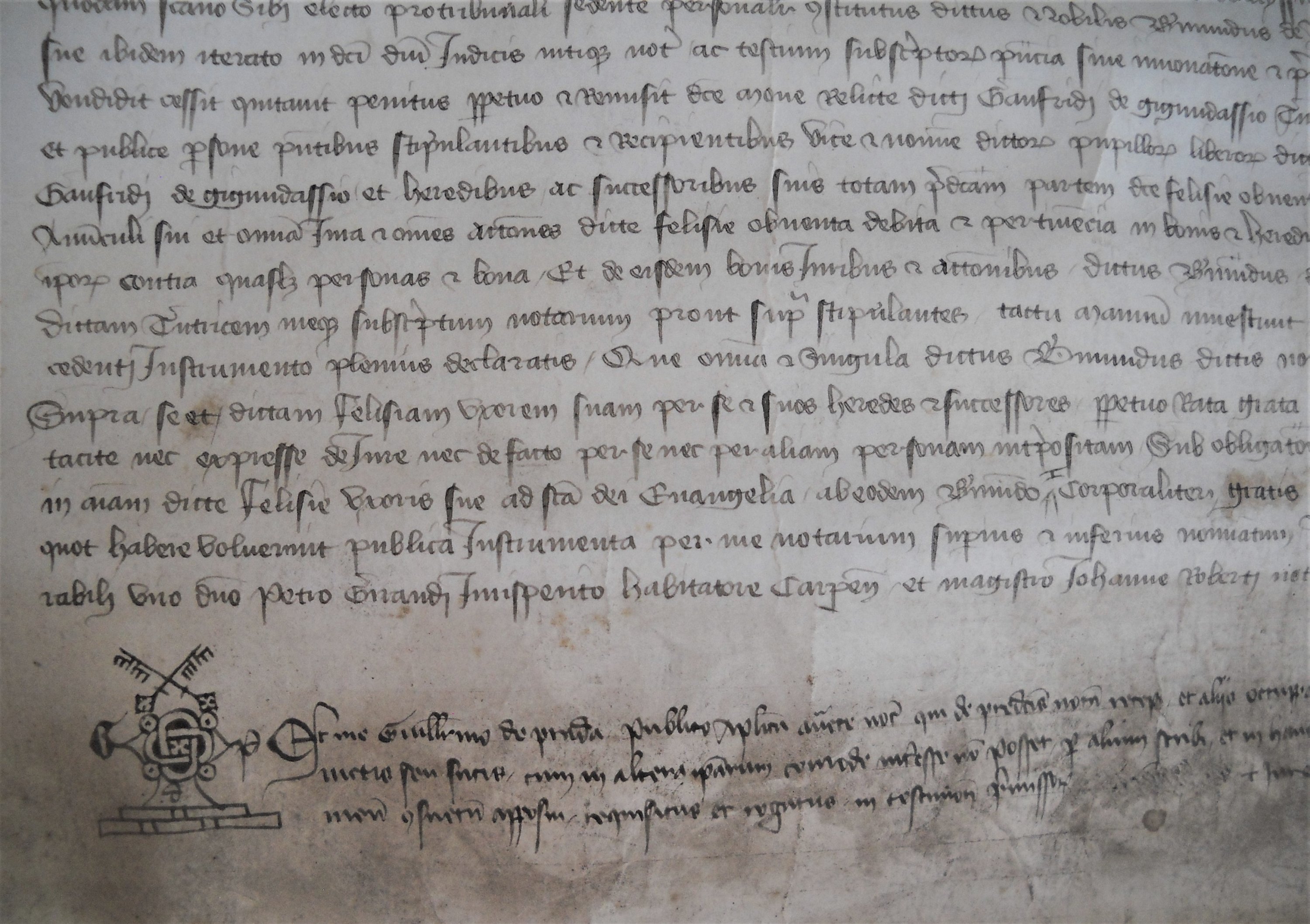 Actes notariés relatifs en majorité à des nobles familles de Carpentras : Coquin, Albaruffo, de Gigondas, Pelletier, dont 2 actes par Pierre de Gigondas notable de Carpentras datés de 1326 47 x 21 cm, et de 1329 60 x 50 cm ; acte par Guillaume de Gigondas daté de 1374, 85 x 44 cm ; le plus long acte concernant les Albaruffo, daté de 1532, mesure 3,30 x 0,63 m ; acte de Cathelin Pelletier de Gigondas coseigneur de Garde Paréol, daté de 1582, 2 x 0,55 m ; etc.