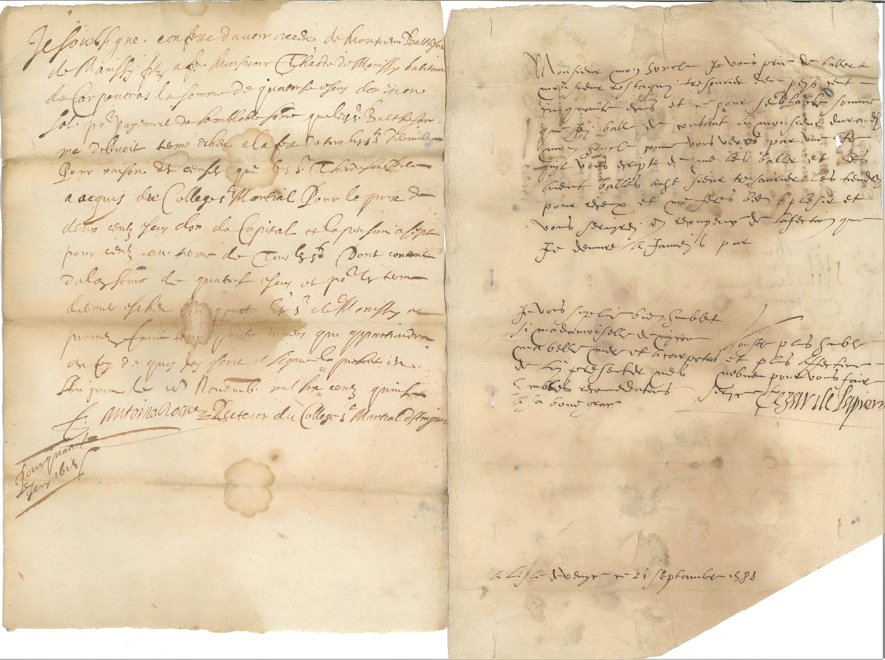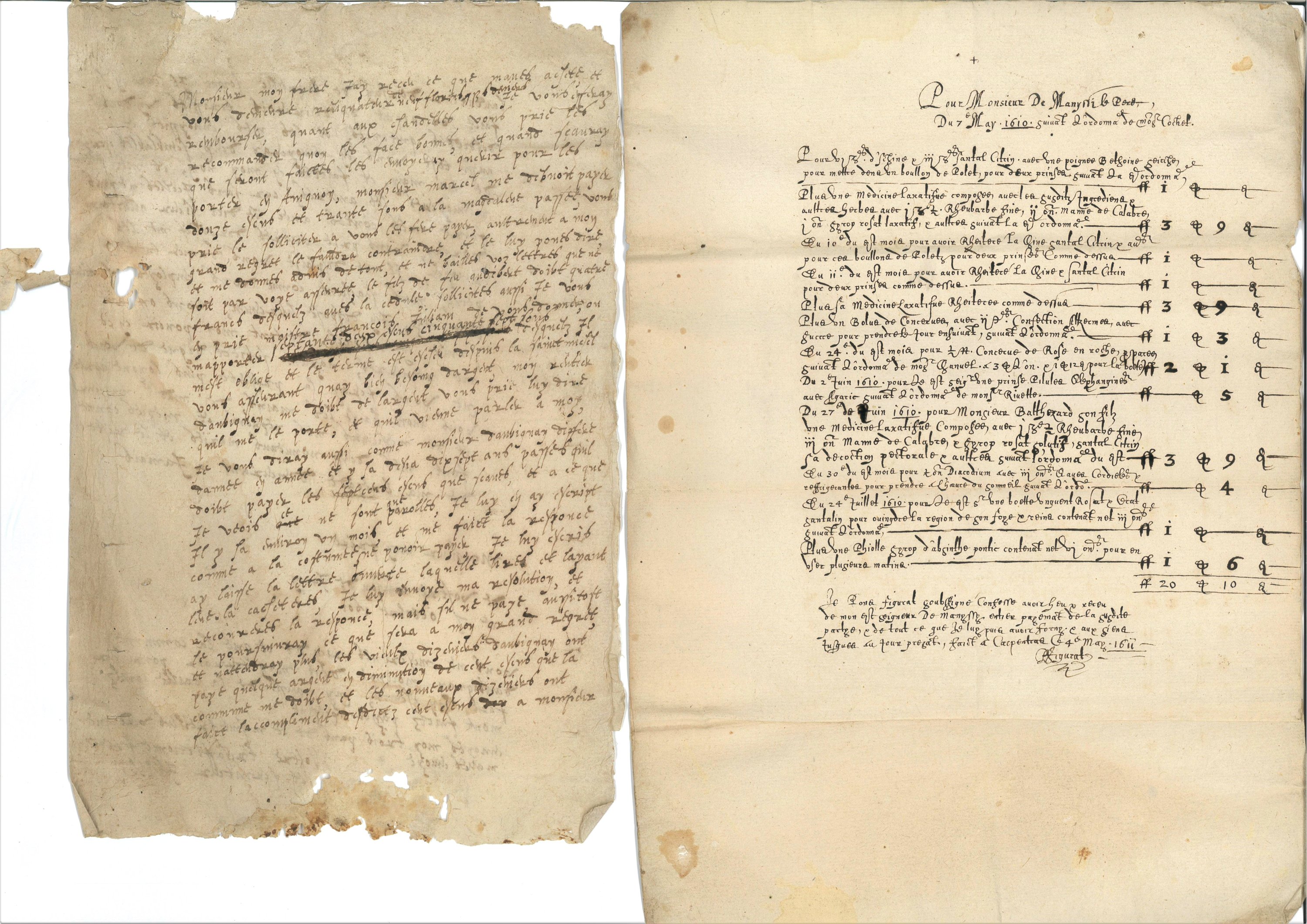 Réunion de 30 pièces manuscrites, 1574-1618, formats et états divers, relatives à la famille de Manissy, dont correspondances et quittances délivrées à Théodore de Manissy de Carpentras, auteur douvrages de philosophie chrétienne.