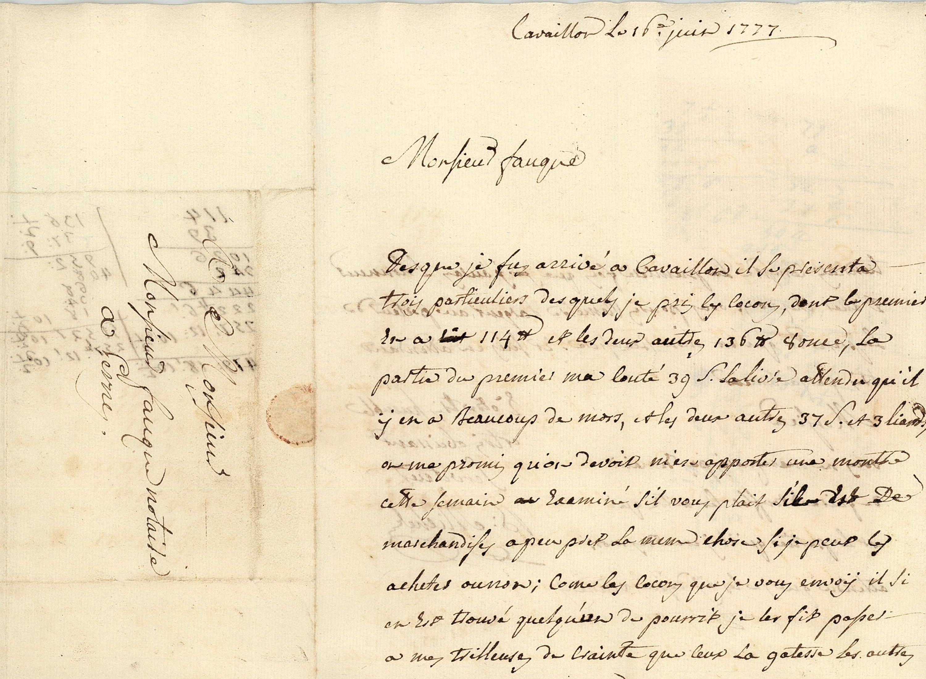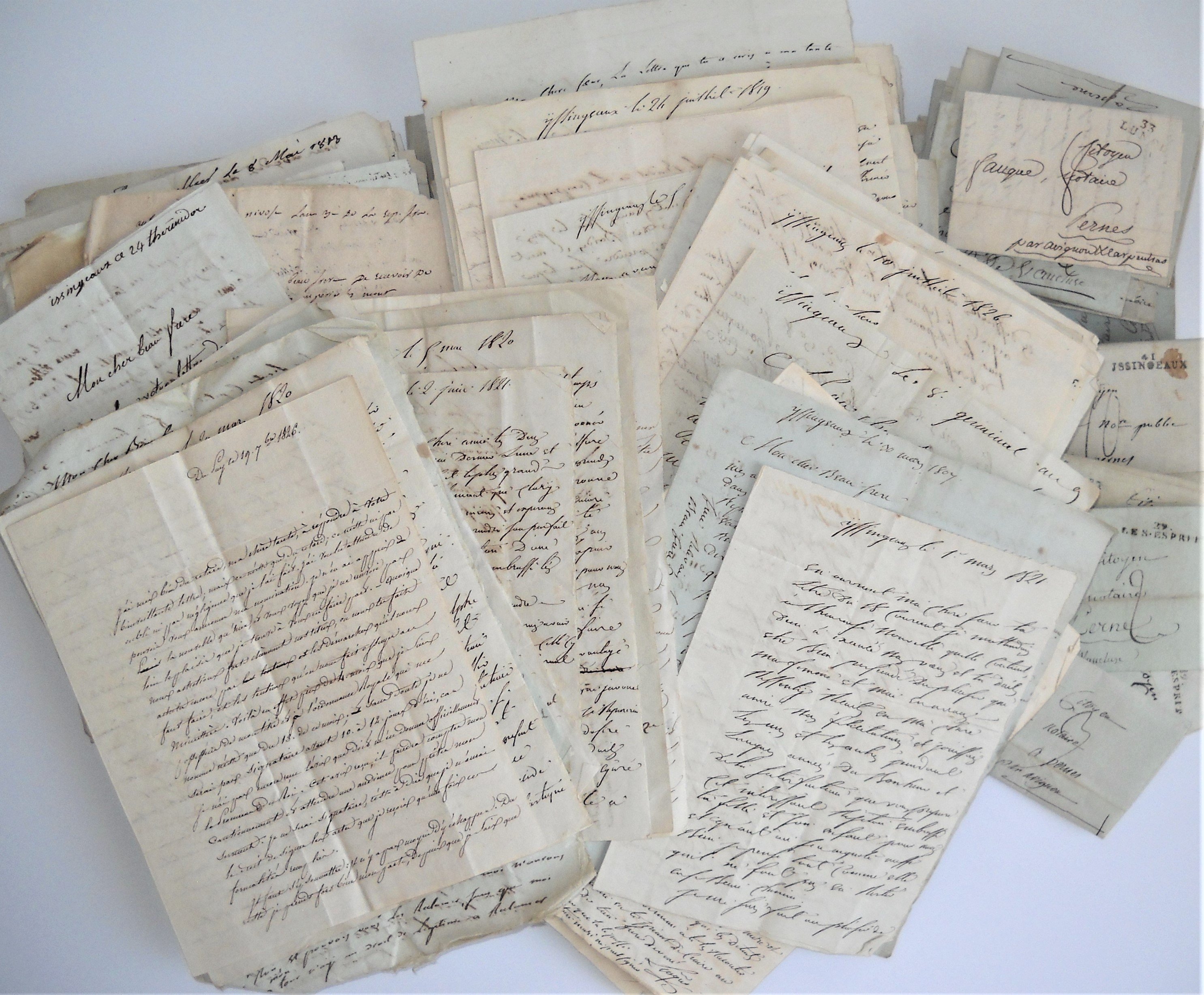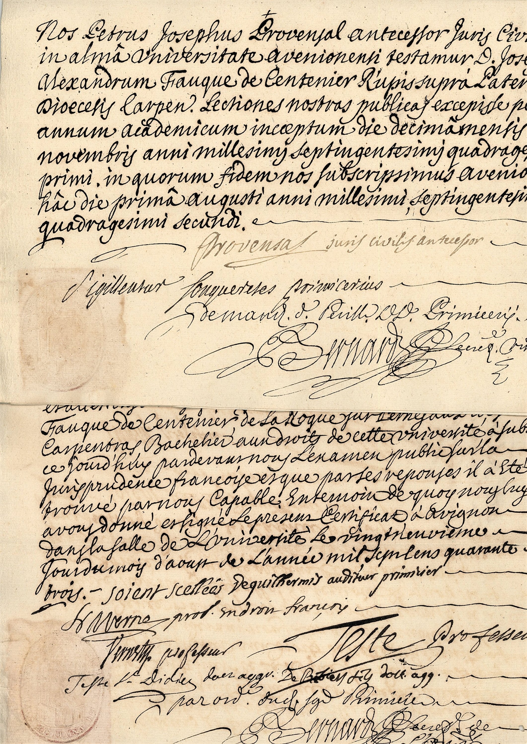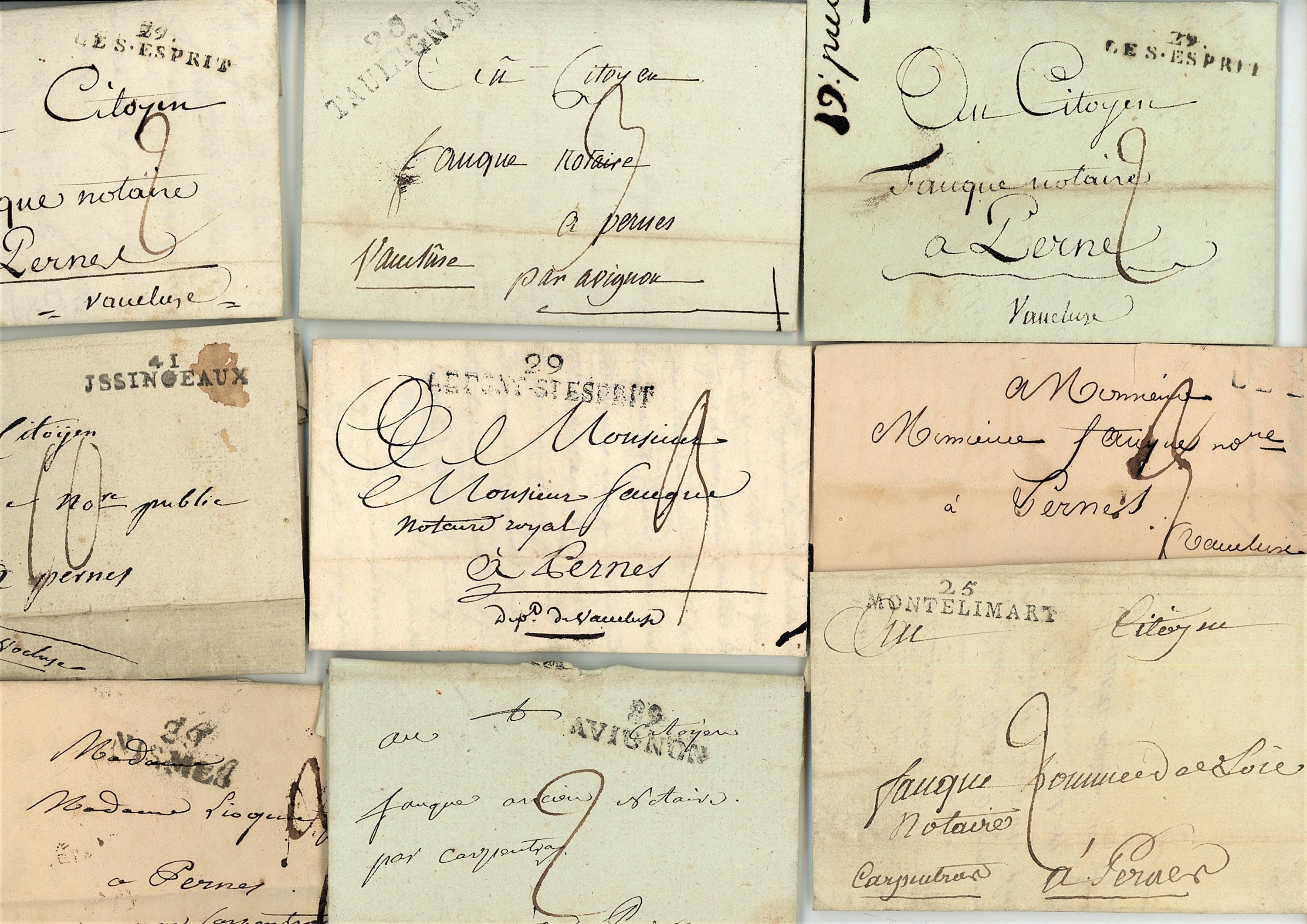 Dispense papale du 4 mai 1759 obtenue par Guillaume François Fauque notaire à Pernes lors de son mariage avec Marie Marguerite Bressy, parchemin oblong ; Diplômes universitaires et investitures, 18e siècle ; Joseph Charles Hilarion Fauque (1744-1819) prêtre chanoine sacristain en léglise Pernes : 25 L.A.S. reçues entre an X et 1818 dont récit du passage du pape Pie VII à Montpellier en 1814 ; Sur mes affaires à Montpellier à dater du 8 avril 1812 et sur mes affaires à Sète, petit cahier de compte manuscrit in-8 relié couv. de remploi aux lettrines médiévales ; Lot de correspondances et mémoires de compte relatifs à la production et au commerce de la soie à Pernes par Fauque de Centenier ; etc.