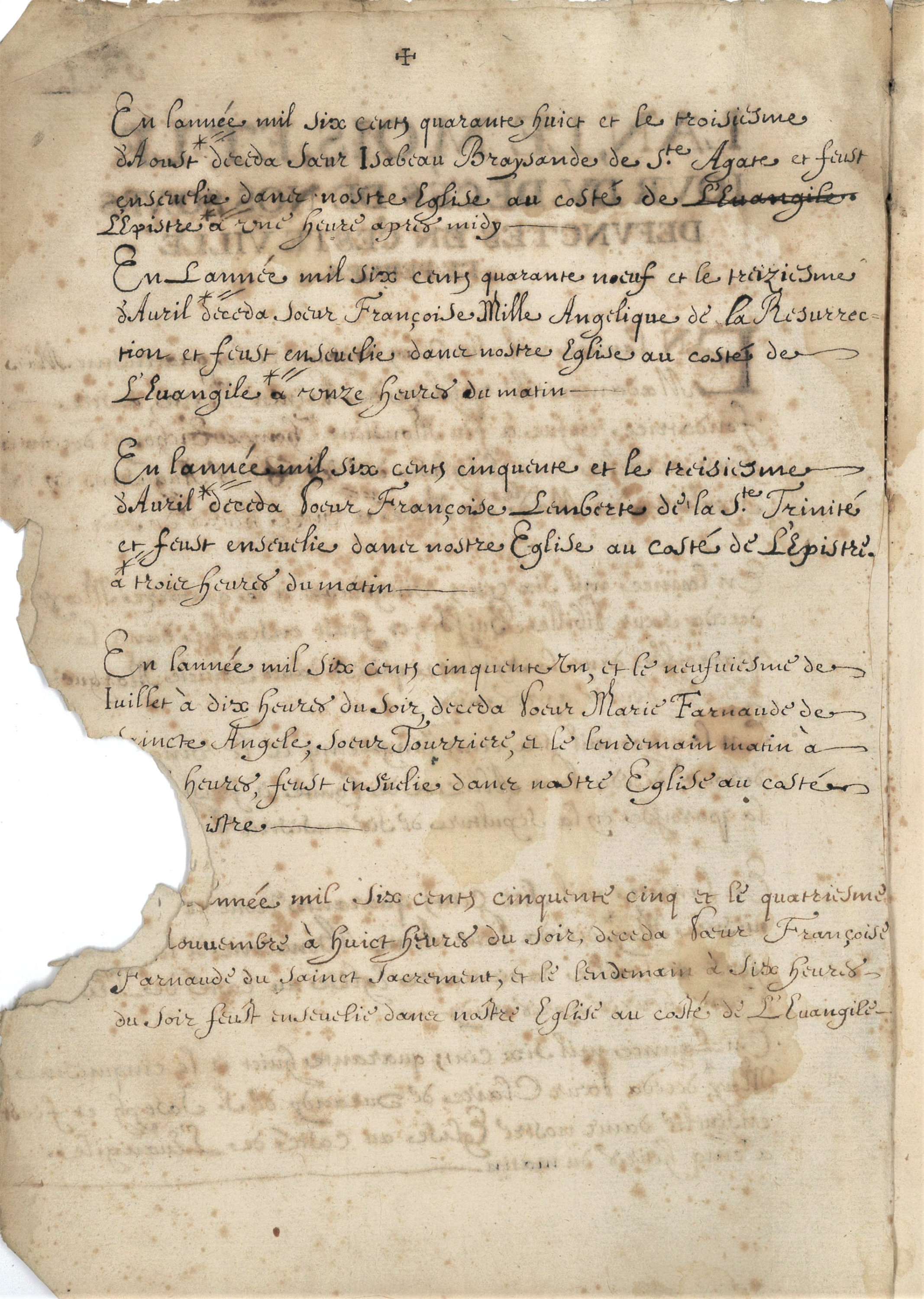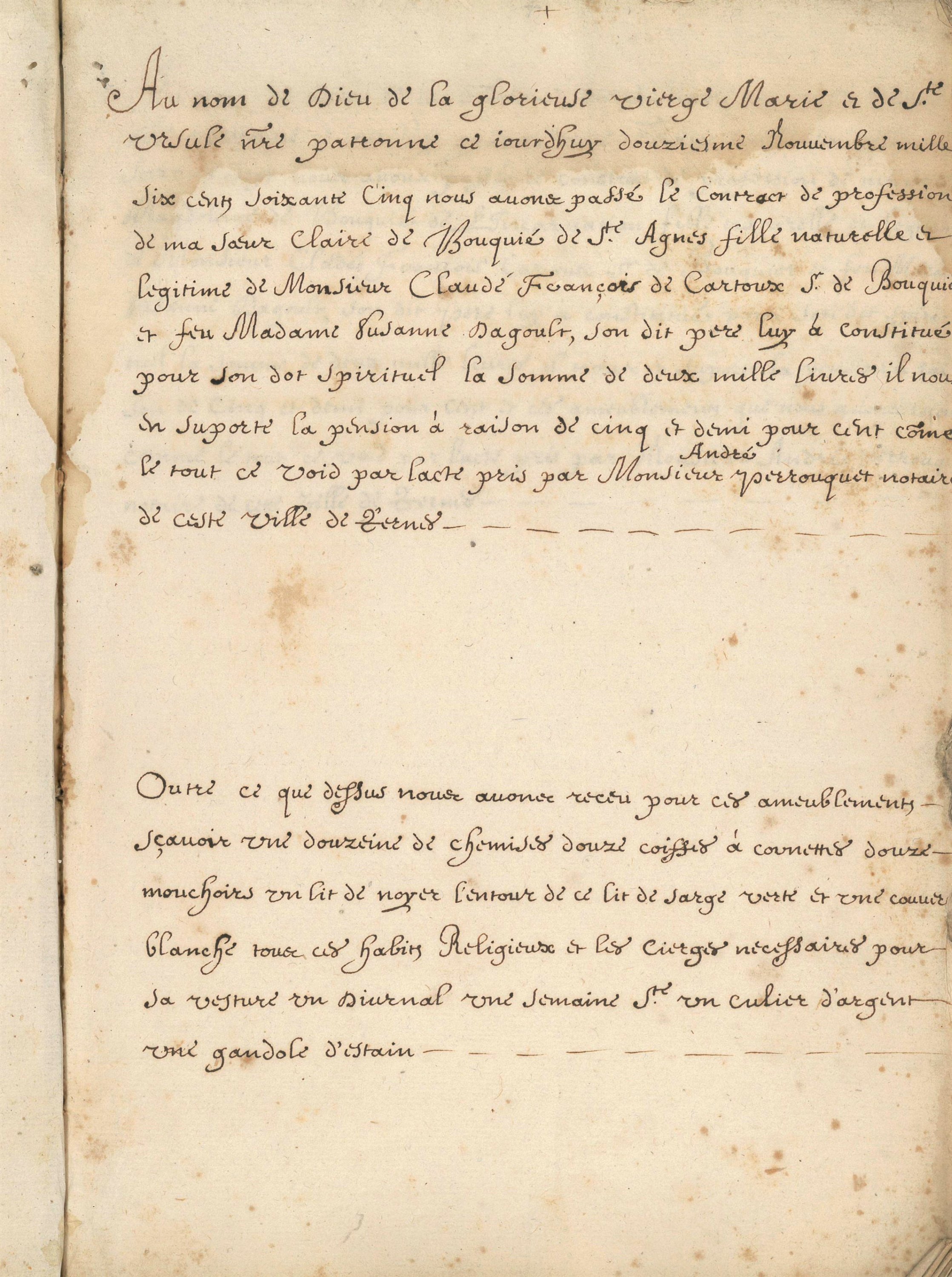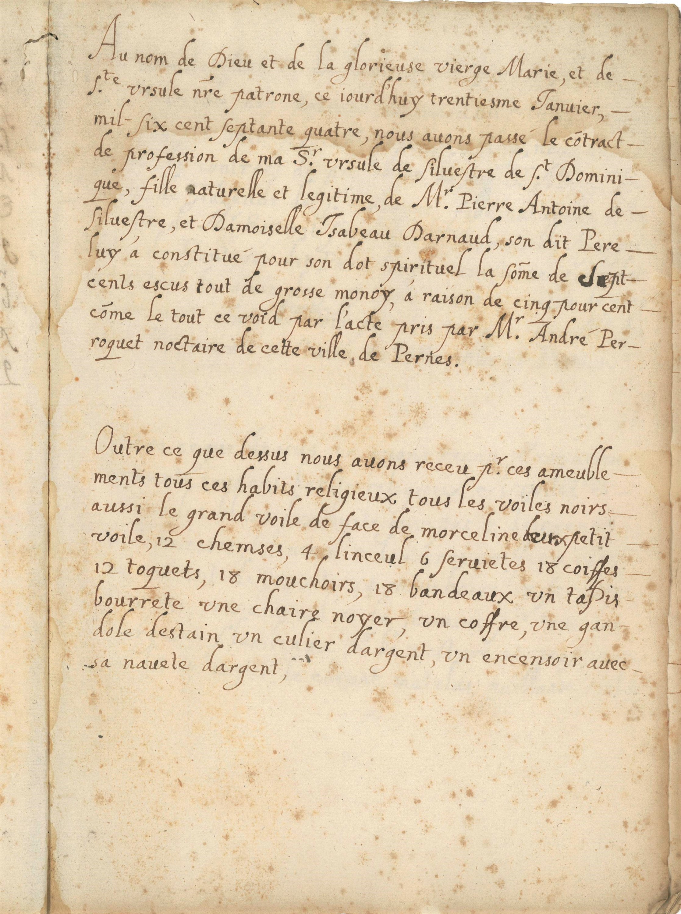 Registre détaillant les sépultures de 1618 à 1656, la réception des professions et leurs dots de 1662 à 1685, des religieuses de la congrégation de Sainte-Ursule de la ville de Pernes ; cahier manuscrit 30 pages in-4 (manques et tâches) ;