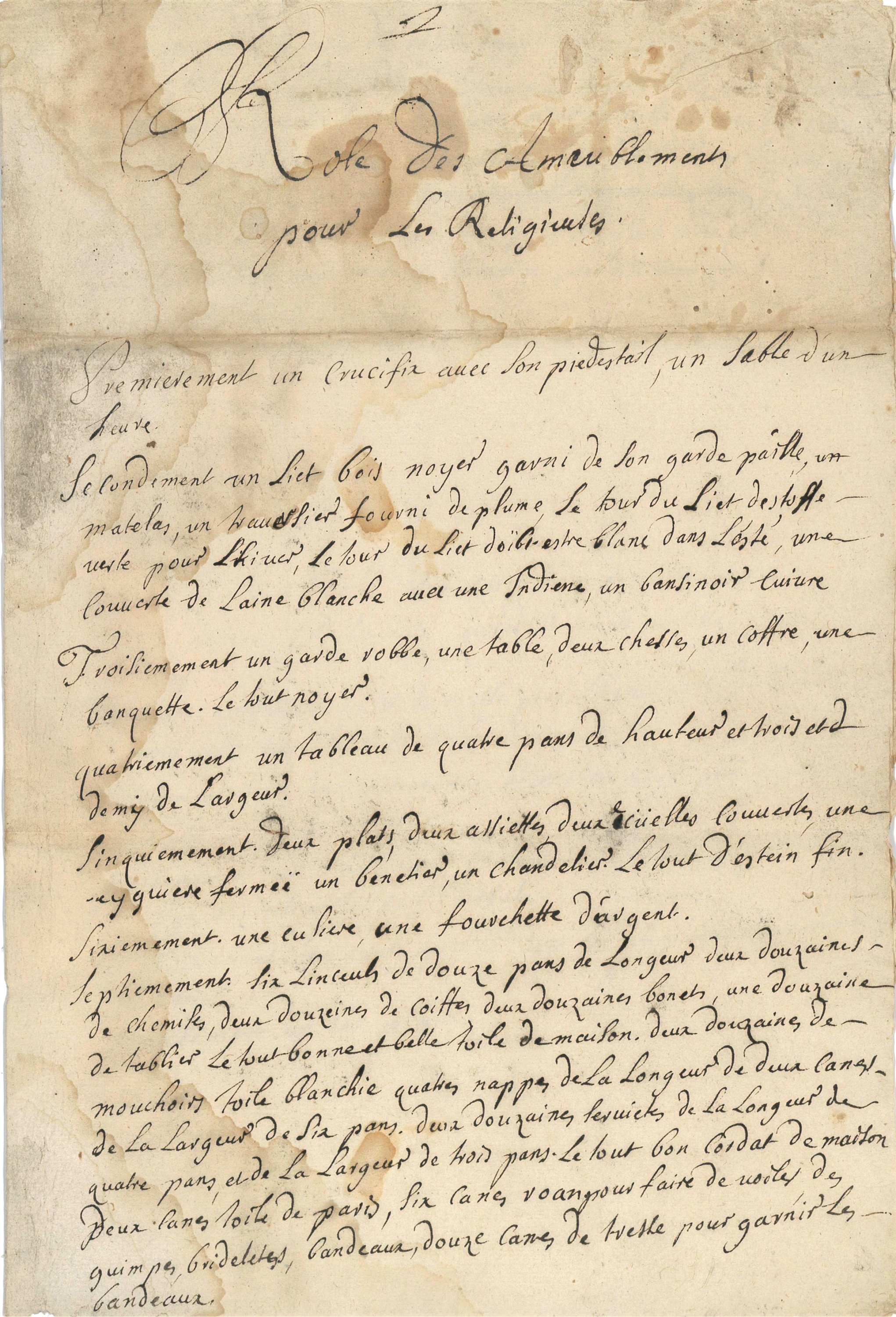 Rôle des ameublements pour une religieuse quand elle passe professe, manuscrit 2 pages in-4 (tâches), fin du 17e siècle ; liste des effets mobiliers et vestimentaires que doit avoir une religieuse professe.